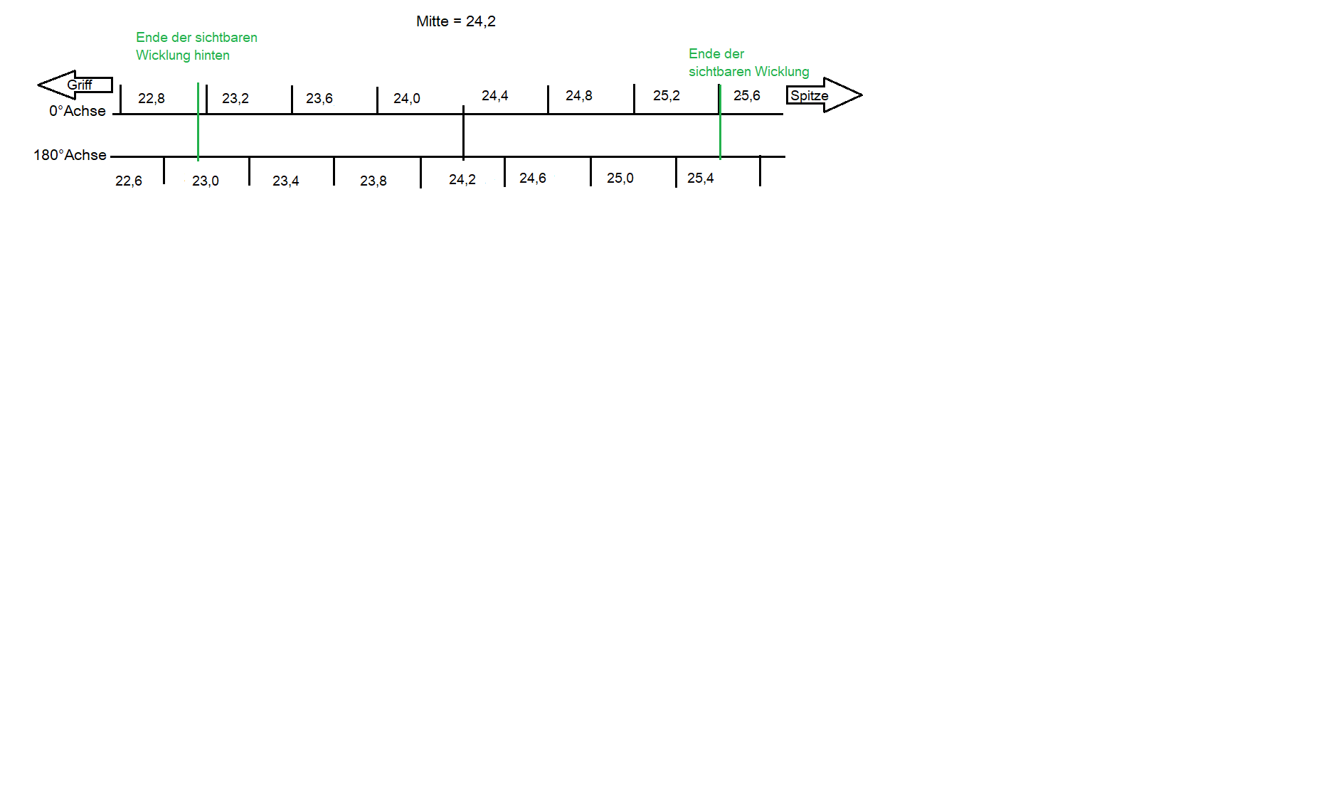 An der Stelle sei auch darauf hingewiesen, dass wenn man Blanks hat mit starker Steigung und/oder sehr lange Wicklungen, man bei den Kreuzpunktabständen in Richtung Spitze von der Mitte her, vielleicht immer plus 0,5-1mm zugeben kann, in die Gegenrichtung abziehen kann.