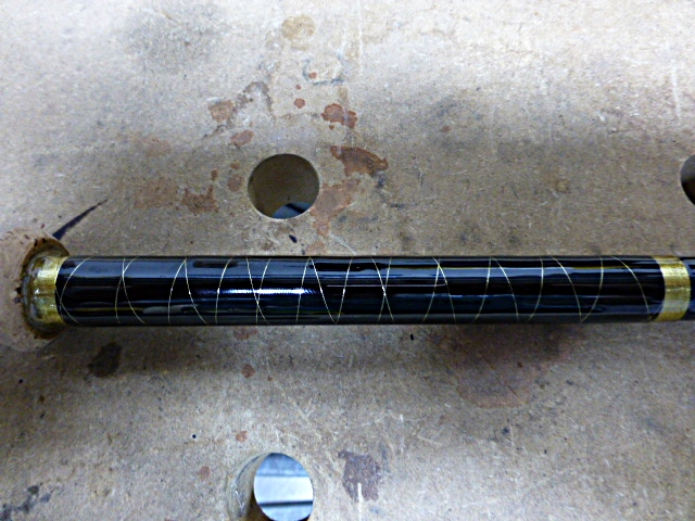 3. Am Ende der "Kreuzwicklung" hast du das ganze mit einem Goldenen Faden abgebunden. Versuche beim nächsten mal den Faden noch etwas mehr zusammen zu schieben, bevor du alles lackierst, dann sieht man auch den Blank nicht mehr so durscheinen.