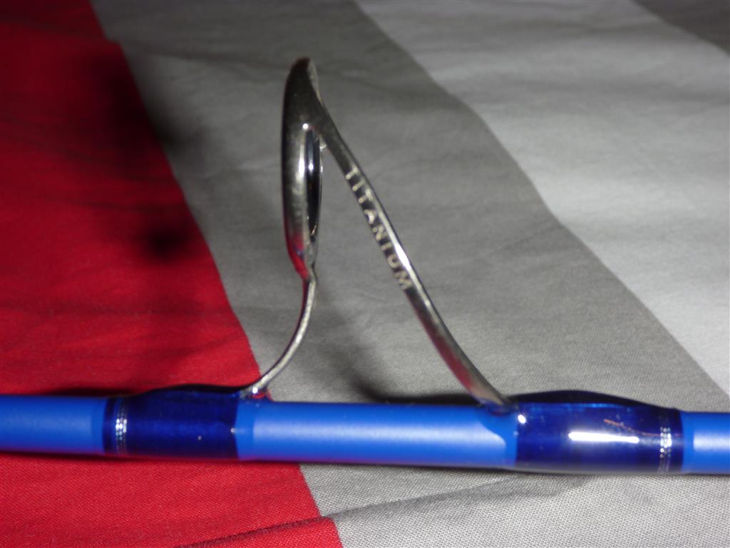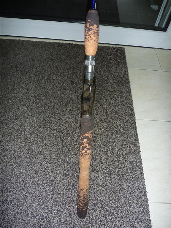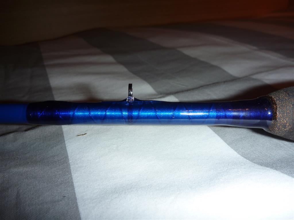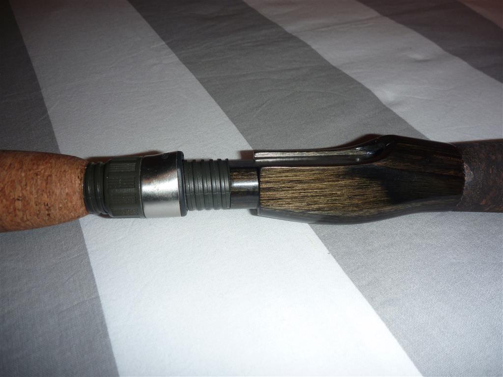 Den griff habe ich mir aus Borl-kork und normalen kork gemacht, den rollenhalter ist aus Holz. Das ganze wiegt etwa 280gr. Die Ringen sind von ALPS, Ti-MNXZG, in die größen 25-16-10-8-8 + 8. Hakenöse ist von TAC. Am griff habe ich einen einfachen kreuzwicklung versteckt, die findet man bei Sonnenlicht, wenn das garn gut beleuchtet is, ist es transparant genug um den kreuzwicklung zu sehen. Damit man den auch sehen kann ist die komplette kreuzwicklung mit silber-garn unterwickelt. Die ringen sind mit ein Sapphire Blue garn, starke A gewickelt, mit eine kleine zierwicklung in Silber. Die rute ist noch nicht ganz fertig, es fehlt noch die endkappe und ein Decal muss auch noch drauf. Die endkappe muss ich noch schleifen, das Decal liegt schon fertig.