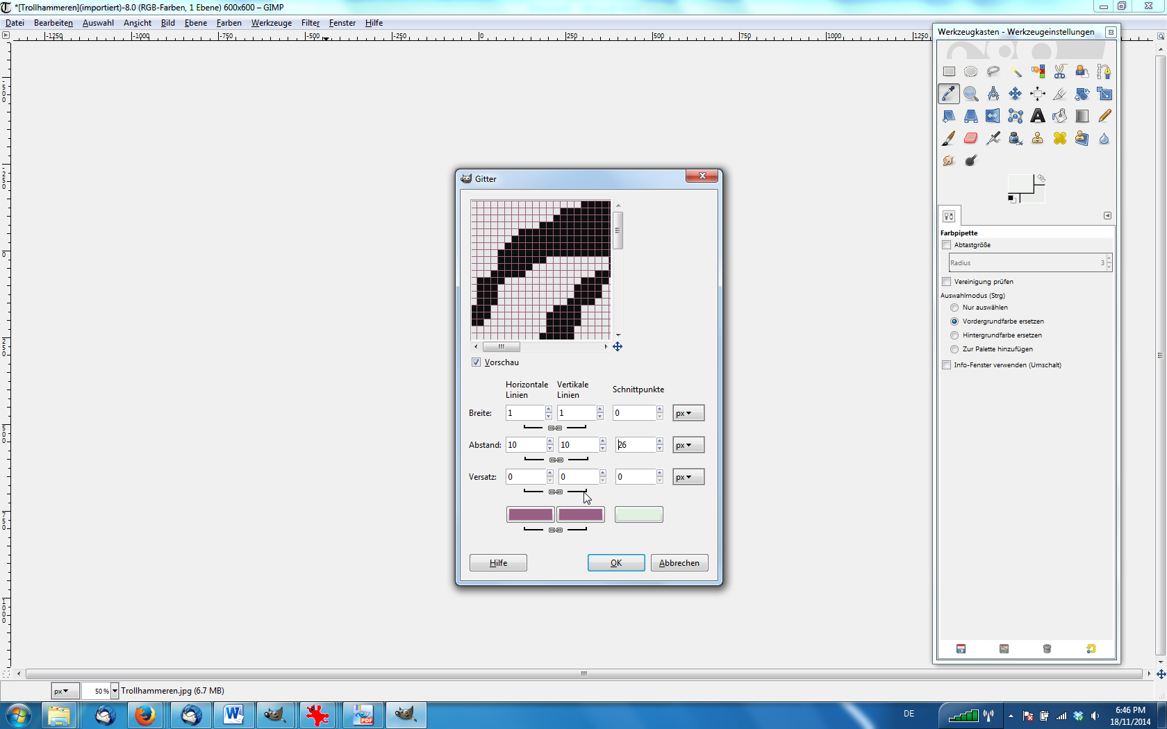 Bei Gimp gibt es auch die Möglichkeit ein Raster sich anzeigen zu lassen, dieses wird aber nicht mit gedruckt. Deswegen auch der Umweg über ein Muster, einfach nur ein Raster einblenden wäre leichter.