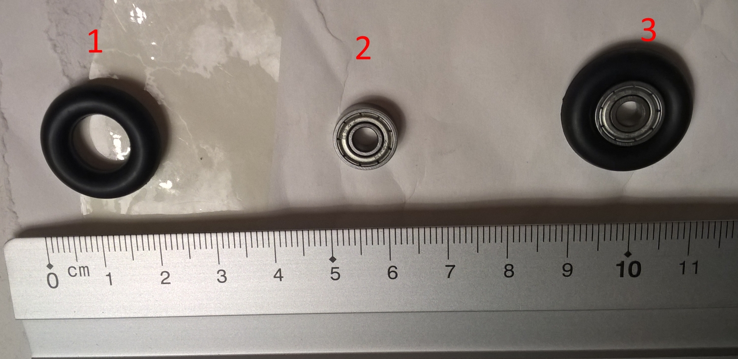 Bei einem Verkäufer der sich "sell4joy" nennt, gibt es O-Ringe. Ich habe O-Ringe (1) besorgt, die haben die Abmessungen 20x5 mm, also einen Außendurchmesser von 20 mm bei einer Schnurstärke von 5 mm. Beim gleichen Händler gibts auch ZZ694 Rillenkugellager (2) mit 11 mm Außendurchmesser, 4 mm Dicke und 4 mm Loch.