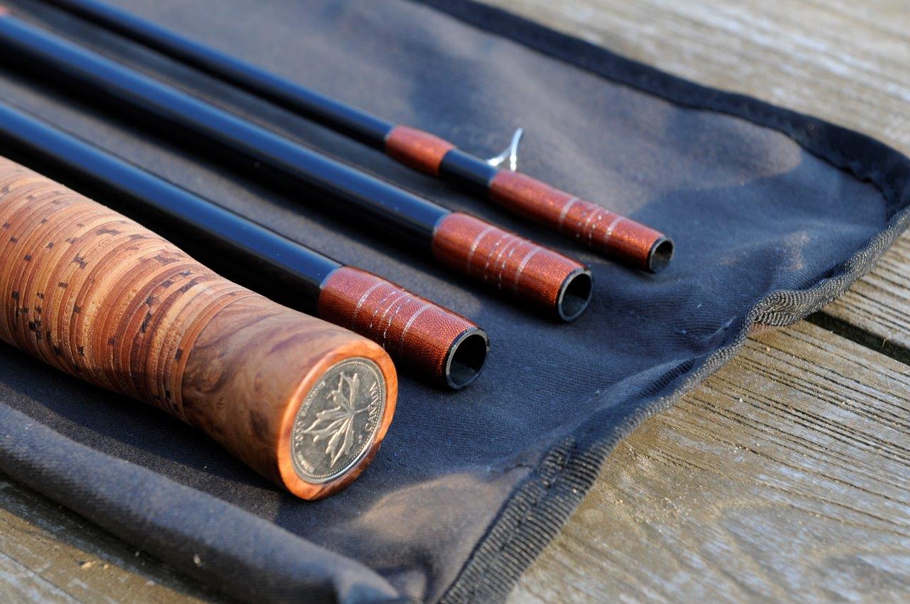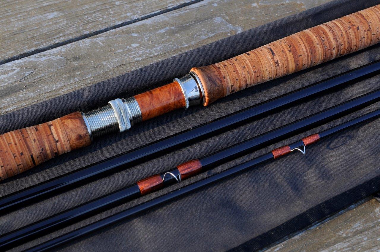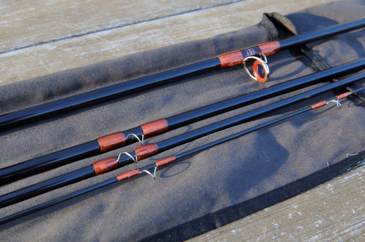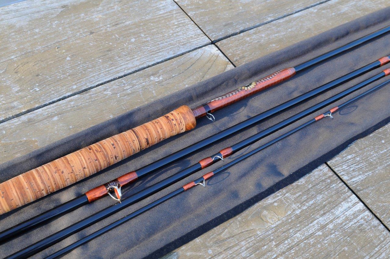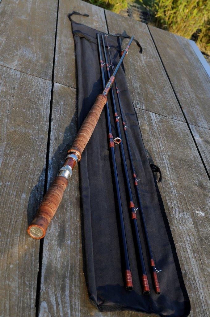 Der Griff ist durch die Amboina-Abschlüsse und die Rinde schwerer als ein normaler Korkgriff. Damit habe ich aber den Vorteil, dass die sonst übliche Kopflast bei Zweihandruten fast entfällt.