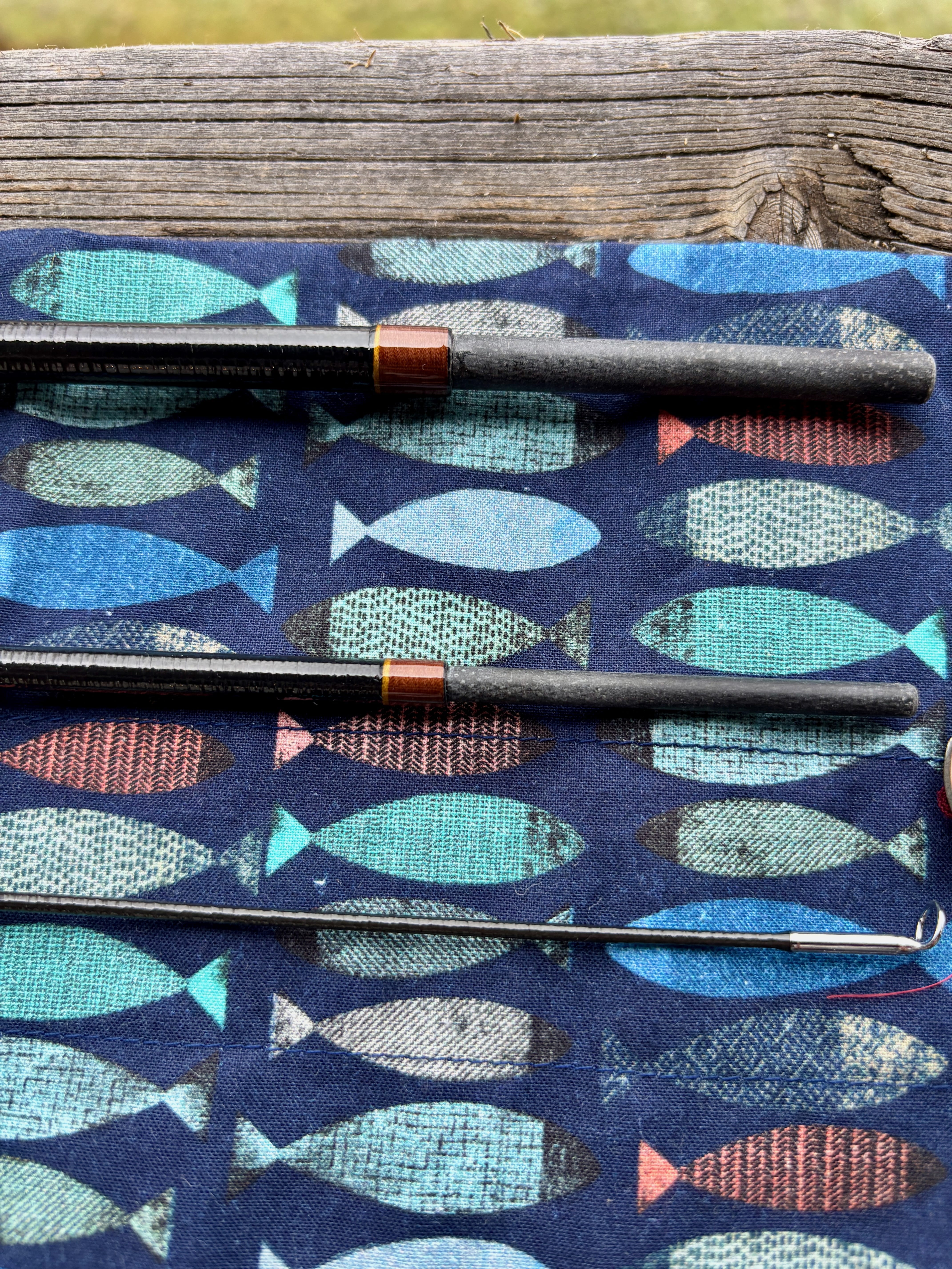 ich finde die Rute schoen aufgebaut, mit den fixierten Wicklungen am Ueberschub hat das schon was ganz besonderes. Der ventilated handle ist eine interessante Sache, mir fehlt da die Erfahrung, wie sich das macht und anfuehlt. Ich denke die Rutenlaenge und Klasse waere auch etwas, was mir zusagt, bei meiner Art zu fischen. Der Rutensack (sagt man das so?) ist wieder unikat und ganz besonders, finde ich.
