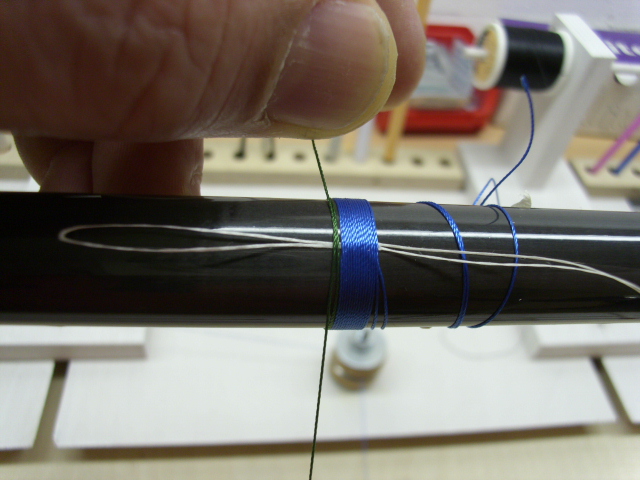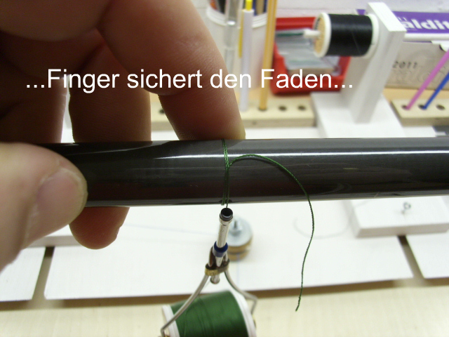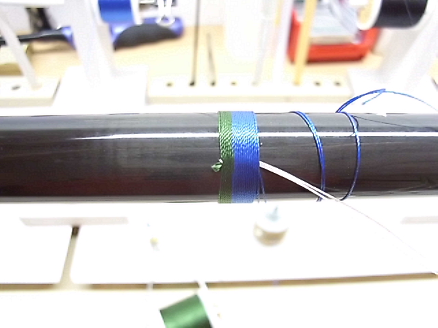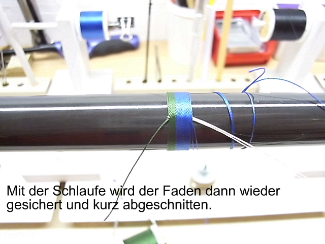 Du legst dazu ca. 15cm Trimmfaden mittig einmal gekreuzt um den Blank und wickelst beide Enden spiralförmig nach hinten. Dann dort festtapen.