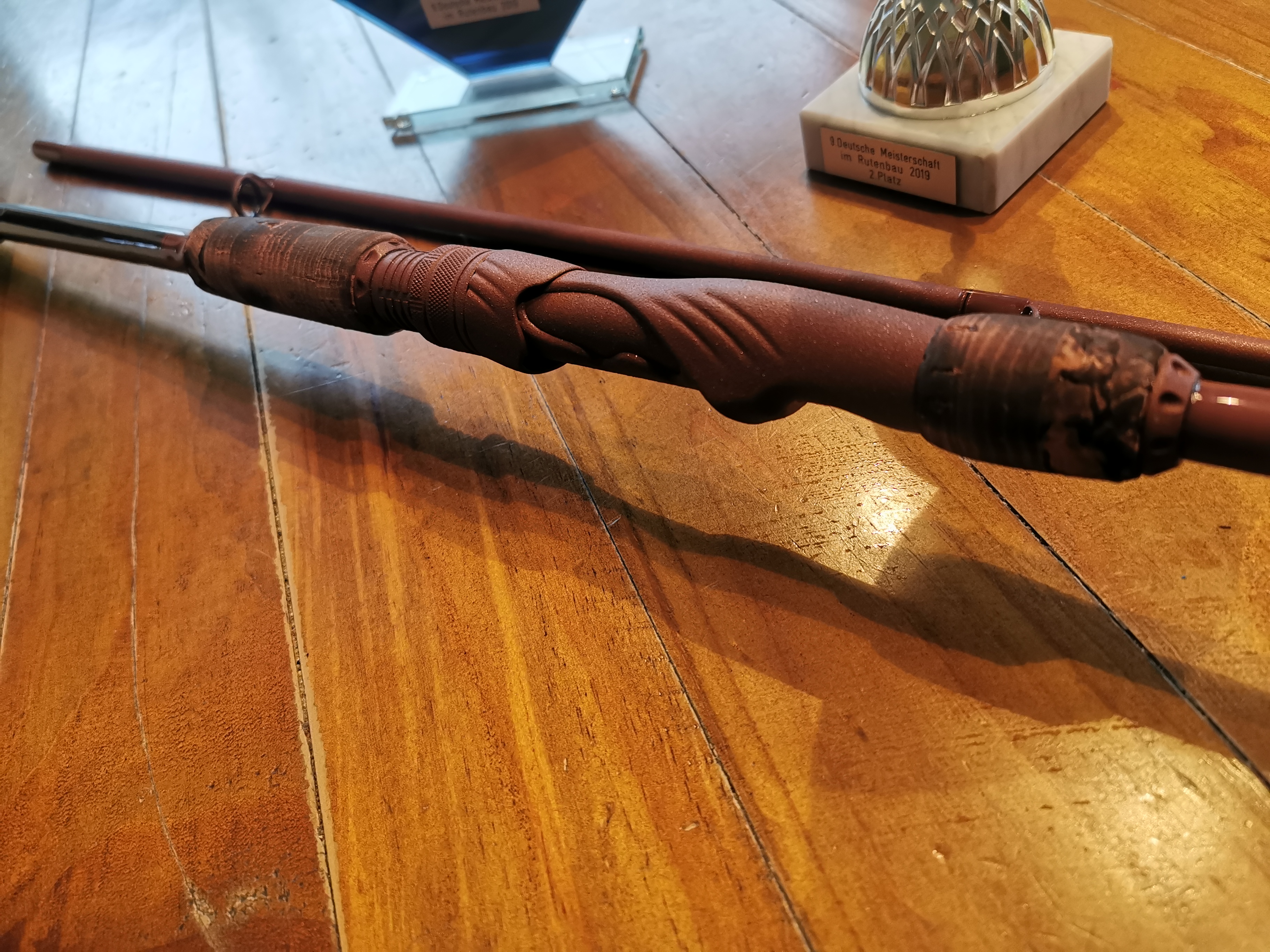 Rollenhalter ist von Alps, leider etwas lang für die Klasse aber der gefiel mir halt am besten, Ringe 11+1, auch von Alps, für ne 6er etwas dickdrahtig aber REC wollt ich nicht dranbauen (wg. Lärmentwicklung). Griff n Fullwells mit 17,5cm und kleiner Fighting-Butt. Hab gestern Abend noch die Wicklung vor dem Griff mit meinem Logo versehen und nochmal drüber lackiert, heute wurde der Griff noch etwas feiner geschliffen, wie einige schon nach dem schleifen sagten und auf den Fotos ersichtlich war der doch etwas grobschlächtig für ne 6er. Nacharbeiten wollt ich aber auch nicht mehr weil ich schon gewickelt hatte. Hat immerhin den 3. Platz ergattert, so hässlich kann sie also nicht sein...
