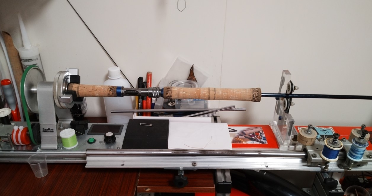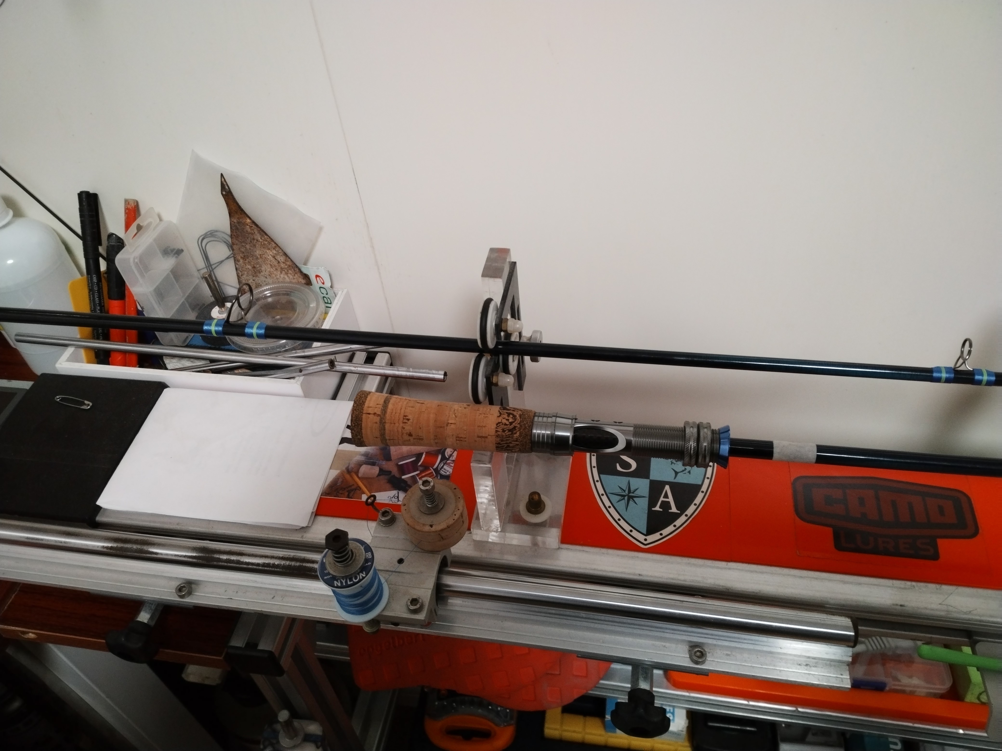 Blank ist 3,40 m lang, soll WT 6/7 sein, laut Verkäufer, und ist blau lasiert. War sicher irgend ein Posten, der über war, da war schon was im Griffbereich angezeichnet. Aus der Serie habe ich noch einen EH WT 6 genommen, aber kürzer. Gewogen hat der Rohblank knapp 67g. Ich habe ein günstiges Set Schlangenringe mit Spitzenring dazu gekauft. Die zwei Starter habe ich ersetzt, durch Ringe von SG, erschien mir gefälliger. Es werden 10+1 Ringe. Ich war erst am zweifeln, ob das einer zu wenig ist, aber ich habe das mit den 10 Ringen in die Messanlage eingespannt, eine Schnur durchgezogen und hoch belastet. Da erschienen mir die 10 Ringe als ausreichend, wobei ich 5 Schlangen auf dem Spitzenteil habe.