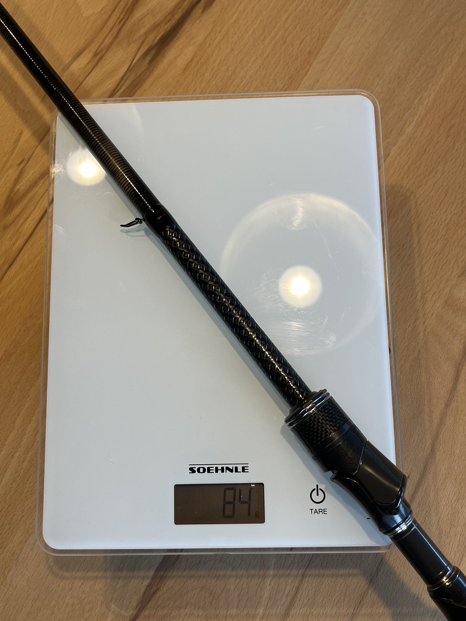 Diese Traumrute wiegt gerade mal 84gr und dabei wurde an nichts gespart, 12+1 Ringe von 7 auf 4 runter, ausreichend große Griffstücke für große Hände, sie liegt wie eine Feder in der Hand.