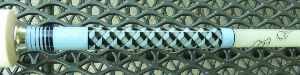 Blank ist ein CTS Quartz 8,6ft Klasse 6 in der Farbe Clear, also transparent weiss. Im Gegenteil zu den üblichen verzapften Glasblanks, bei denen aufgrund der Zapfen auch immer Kleberreste durchscheinen, sind die aktuellen CTS Quartz mit einer normalen O/U Verbindung versehen, es gibt also keinerlei Farbabweichungen und das Finish ist perfekt. Thema des Wettbewerbs war das Heimatland bzw. die Heimatstadt. Da kam bei mir also nur Bayern in Frage also ist das ganze in Blau/weiss gehalten. Beringt wurde 11+1 mit Recoils, der RH und WC kamen von T24 weil ich im Winter zwar eine Drehbank gekauft hab, damit aber nicht ausreichend umgehen konnte um einen eigenen anzufertigen. Griff ist aus Kork und Elfenbeinersatz (Elforyn Supertusk) mit Einlagen aus schwarzem Juma und Vulcanfiber, dazu reichten meine Drehfertigkeiten grade noch aus. Um dem ganzen die "bayerische Note" zu geben ist auf dem Spacer ein Stocknagel mit diversen bayrischen Spezialitäten aufgeklebt und mit "Fake-Nägeln" gesichert. Weisswurscht und Brezn hat den Amis wohl gefallen... Lachen-5