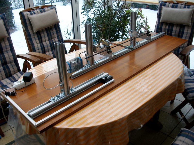 Das läuft nun wunderbar, vorallem gleitet das wirklch sehr gleichmäßig. Da kann man wirklich von einem Gleiten sprechen. Alles bombenfest ohne Spiel. Da der Auszug recht lang war, kann ich die Garnhalterung nun auf einer Länge von ca. 50 cm hin und her gleiten lassen. Will ich noch weiter, muss ich kurz die zwei Schrauben am Nutstein lösen und den Auszug nachholen.