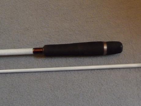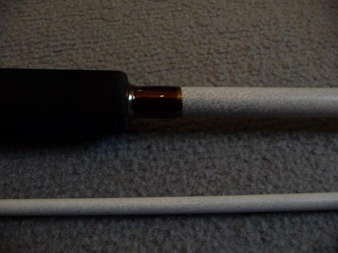 ), also habe ich die Ringe vorsichtig abgemacht und den Blank mit 600er und 1000er Schleifpapier angeschliffen. Lange war ich am gucken was mir denn so gefällt, habe mich durchs Forum gelesen und dabei einige nette Sachen zum Lackieren gesehen, und vorhin habe ich's dann gemacht. Weißen Lack aus der Sprühdose sollte es werden, vorher habe ich den Griff abgeklebt. Eigentlich sollte der Blank ganz weiß werden, doch jetzt ist der Blank optisch so ähnlich wie ein weißer Fuji Matagi Rollenhalter. Unerwartet.... und doch finde ichs super.