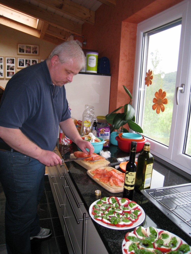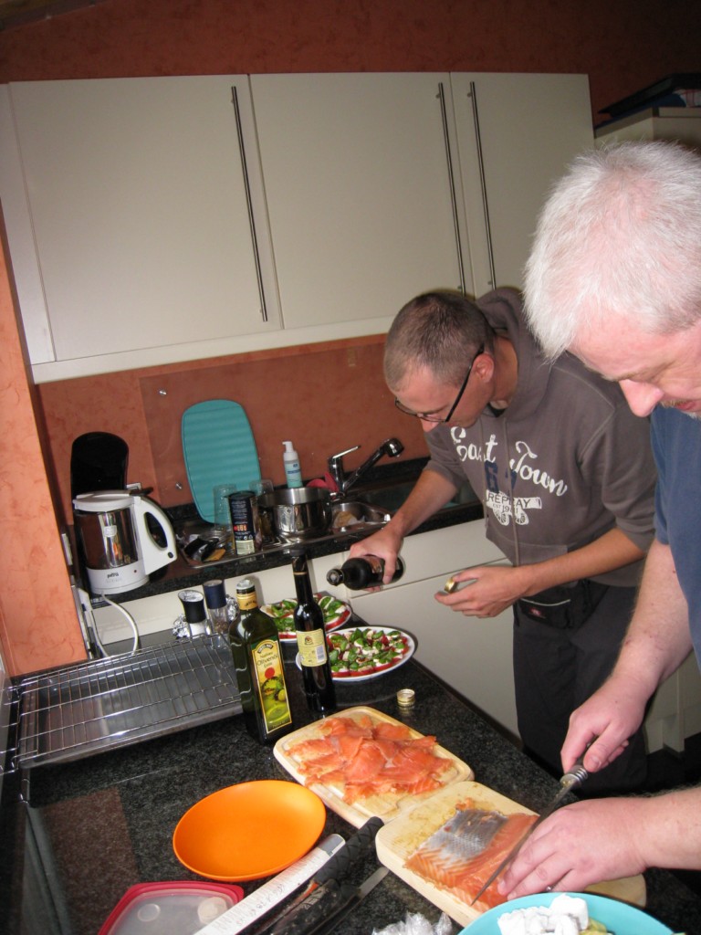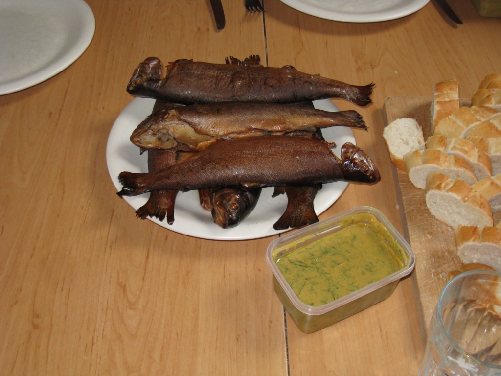 Axel hat uns ein schönes Stück von seinem Dänemark Lachs gebeitzt mitgebracht mit Senfsoße und Baguette, Markus steuerte sebstgezüchtete Tomaten mit Mozarella und Basilikum bei und ich habe einige Forellen frisch geräuchert.
