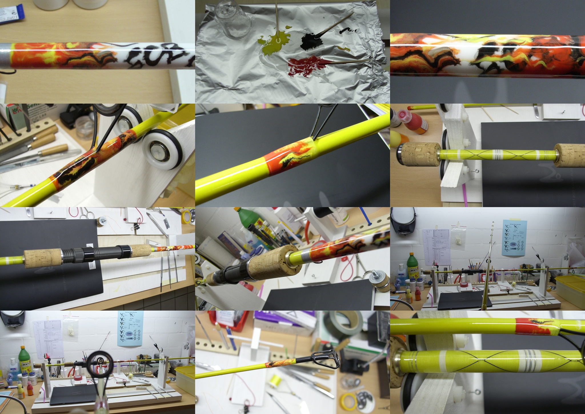 Du wolltest zuerst die Wicklung im Grunde so gelb haben wie dein Blank? Dann hättest du die Ringe aufs nackte Blank wickeln müssen und lackieren. Jetzt alles abkleben was keinen Lack abbekommen soll - natürlich die Ringe sehr sauber schützen. Jetzt alles komplett lackieren.