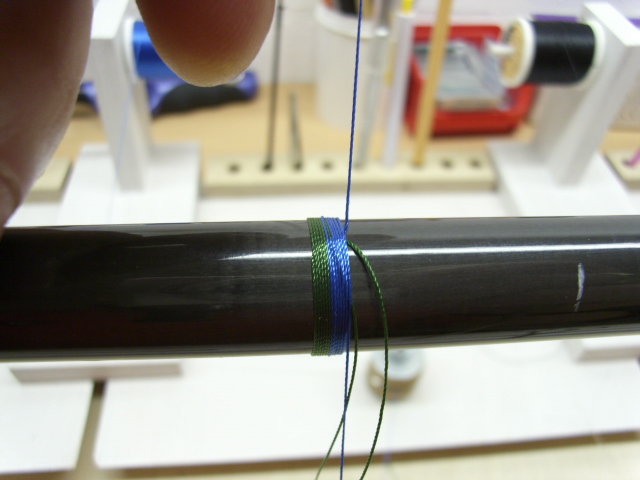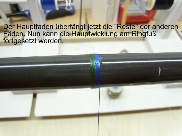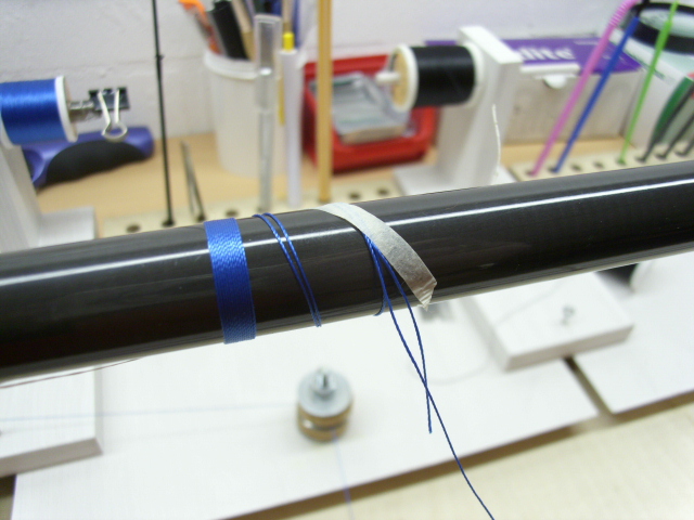 Du legst dazu ca. 15cm Trimmfaden mittig einmal gekreuzt um den Blank und wickelst beide Enden spiralförmig nach hinten. Dann dort festtapen.