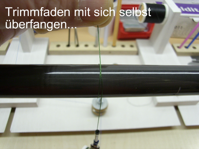 Dann legst du nach der ersten Kreuzung des Trimfadens die Hauptwicklung an und machst ein paar Schläge. Dann nimmst Du das Tape weg, öffnest also die Trimmfäden wieder. Jetzt nimmst Du einen Zahnstocher oder was ähnliches Spitzes und stellst ihn fest direkt hinter den ersten Kreuzungspunkt der Trimmfäden, also vor der Hauptwicklung! und ziehst mit den beiden offenen Enden des Trimmfadens fest. Nur noch Packen und FERTIG!