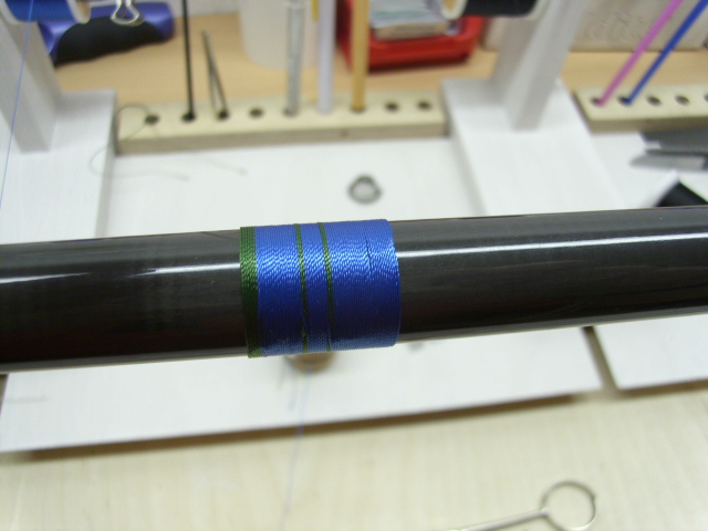 ich frage mich nur, weshalb du den blauen faden über die wenigen grünen wicklungen laufen lässt und nicht darunter, dann hast du einen reinen grünen teil.