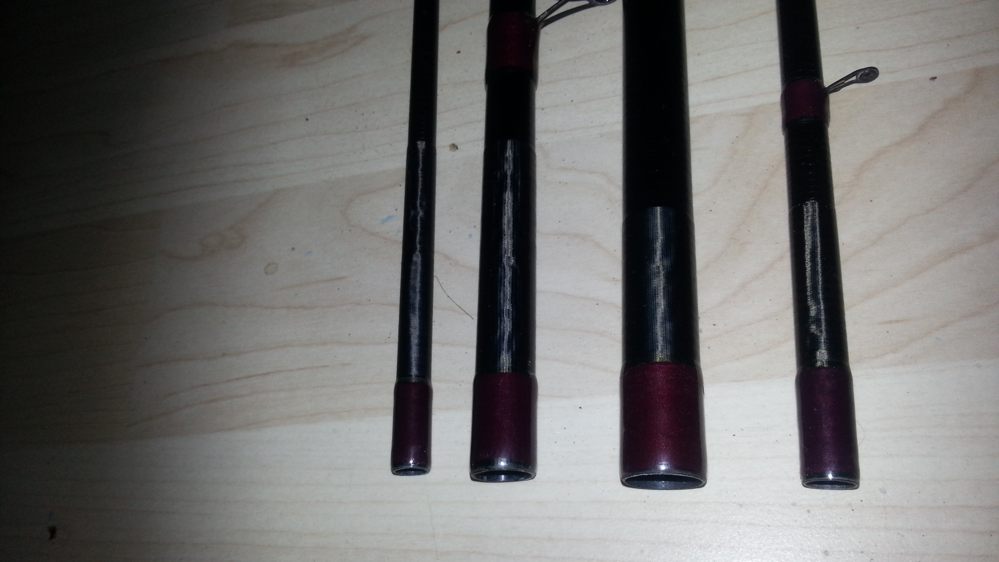 Heute wickele ich diese Stellen und auch die "offiziellen" Teilungsenden manchmal mit fireline statt Bindergarn, da diese 0 Dehnung hat, im Gegensatz zu Bindegarn, dass scheinbar auch im lackierten Zustand noch etwas flexiebel ist.