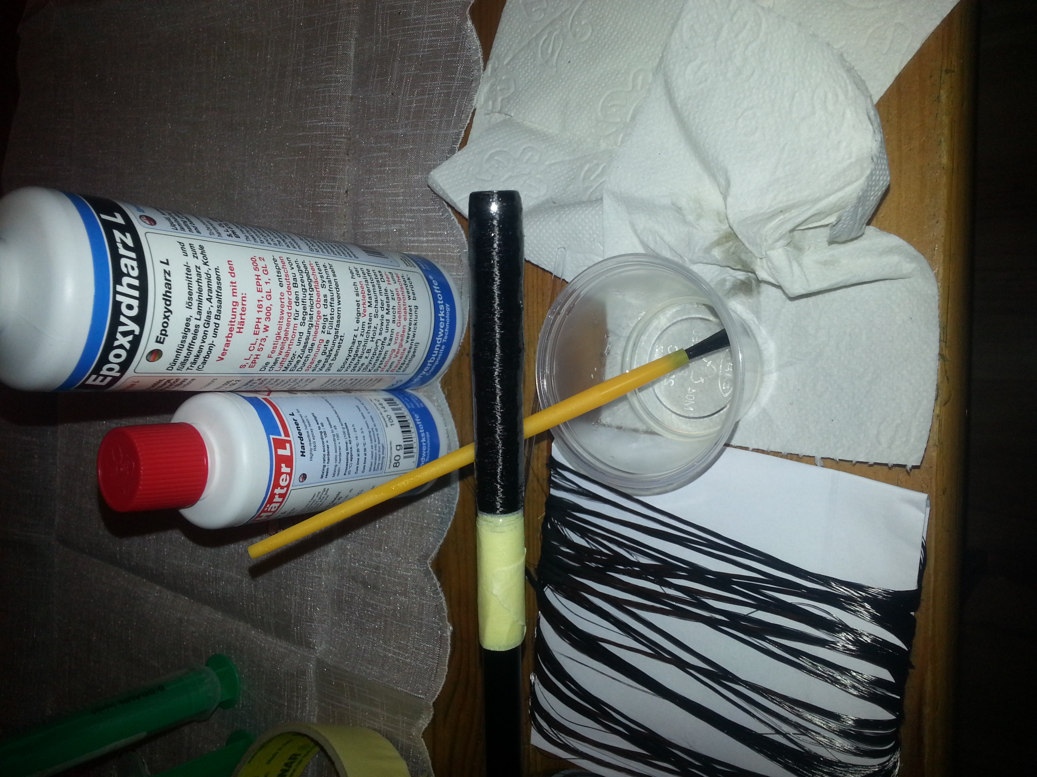 Ich bestreiche die Stelle dünn mit dem Kleber, wickel dann das Carbonroving, erwärme die Stelle mit dem Fön, streiche überflüssiges Harz ab und überwickel die Stelle dann straff mit umgedrehten Isolierband.