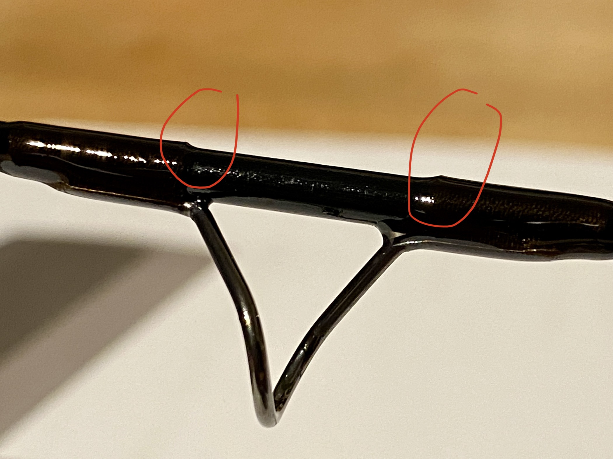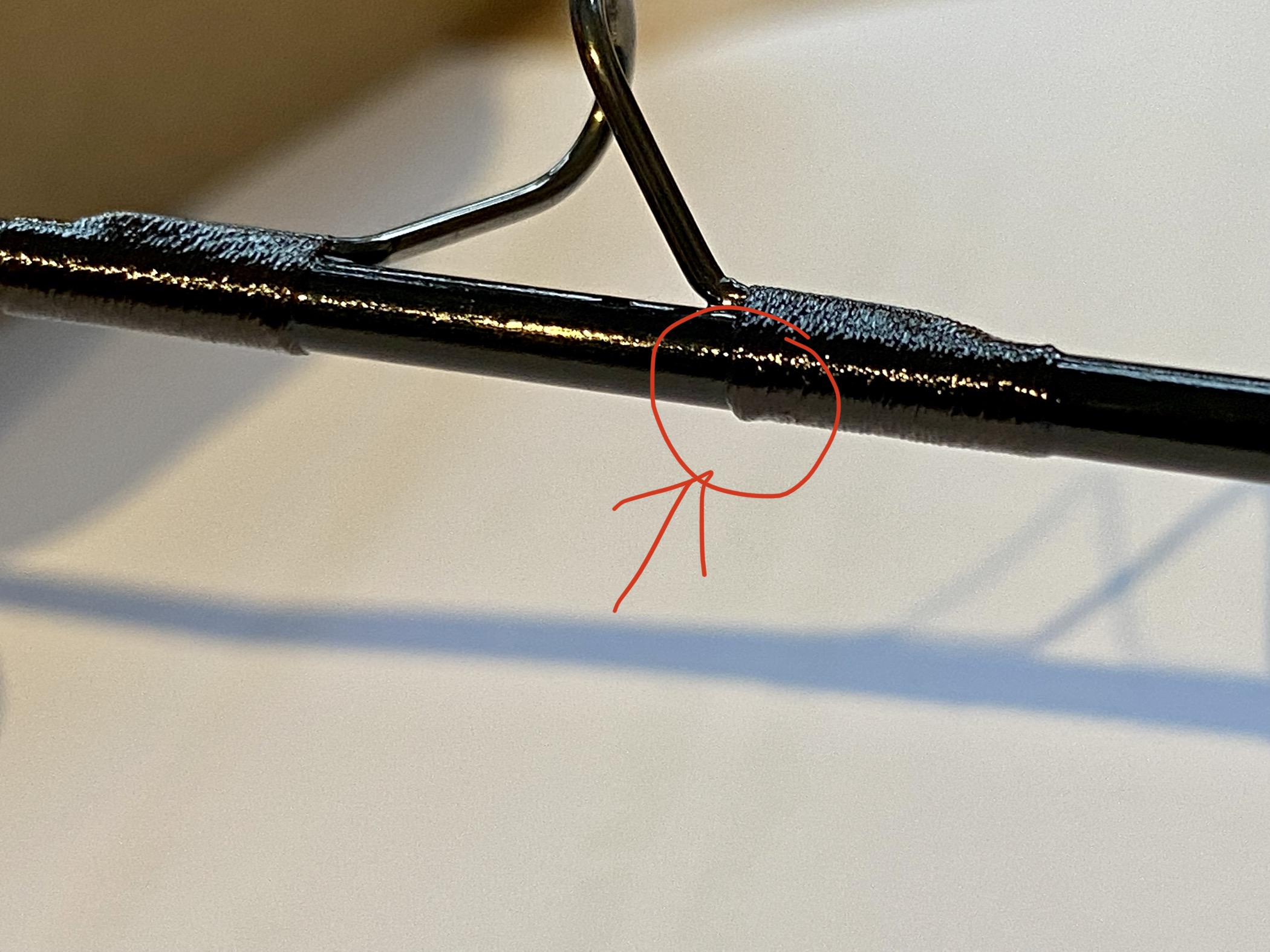 Zu Demonstrationzwecken habe ich mal einen angewickelten 1- Beinring um 180° am blank verdreht, also auf die gegenüberliegende Blankseite. Die Wicklung musste nur ein klein wenig nachgerichtet werden.