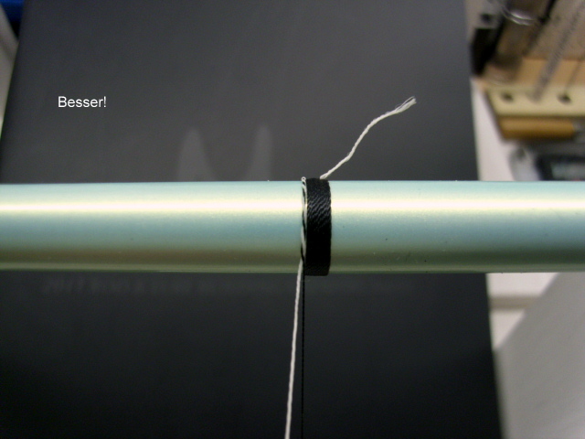 Meiner Erfahrung nach sieht das ganze besser aus, wenn der eigentliche Wickelfaden in Stärke"D" und der Zierfaden in Stärke "A", ausgeführt wird. Den Zierfaden kann man auch doppelt legen, schaut dann nicht gar so fein aus...