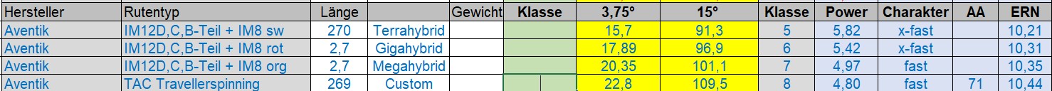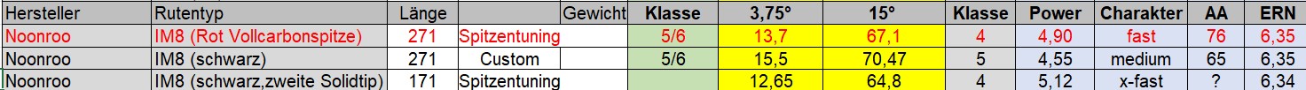 Anbei die Daten der Ruten mit den verschiedenen Spitzen. Bilder mache ich vielleicht auch noch.