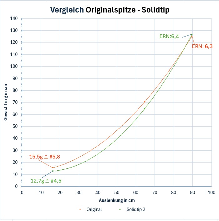 Der Übergang zum Solidtip wird fast unsichtbar, wenn man ihn so platzieren kann, dass ein Ring darauf sitzt. Das Spitzenteil mit der Solidtip ist mit 4,7g kaum schwerer als das Originalteil mit 4,6g. Ganz in der Spitze halte ich es sogar für leichter.