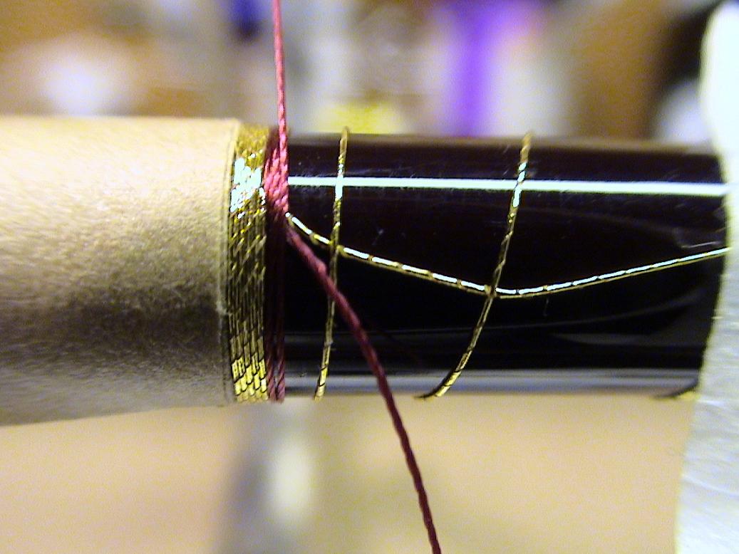 Wenn du ca. 10 Wicklungen mit dem normalen Garn gemacht hast hältst du das blank fest. Mach jetzt mit dem Zierfaden die entsprechende Anzahl an Wicklungen und zieh das Ende mit der Schlaufe unter die normale Wicklung wie du es auch immer zum Abschluss einer Wicklung machst. Nach etwa 15 Wicklungen lässt du beide Enden des Zierfadens aus der normalen Wicklung herausschauen (Ich empfehle dir die Enden erst kurz vor dem Lackieren mit einer Klinge bündig abzuschneiden, damit du ev. etwas nachspannen kannst)