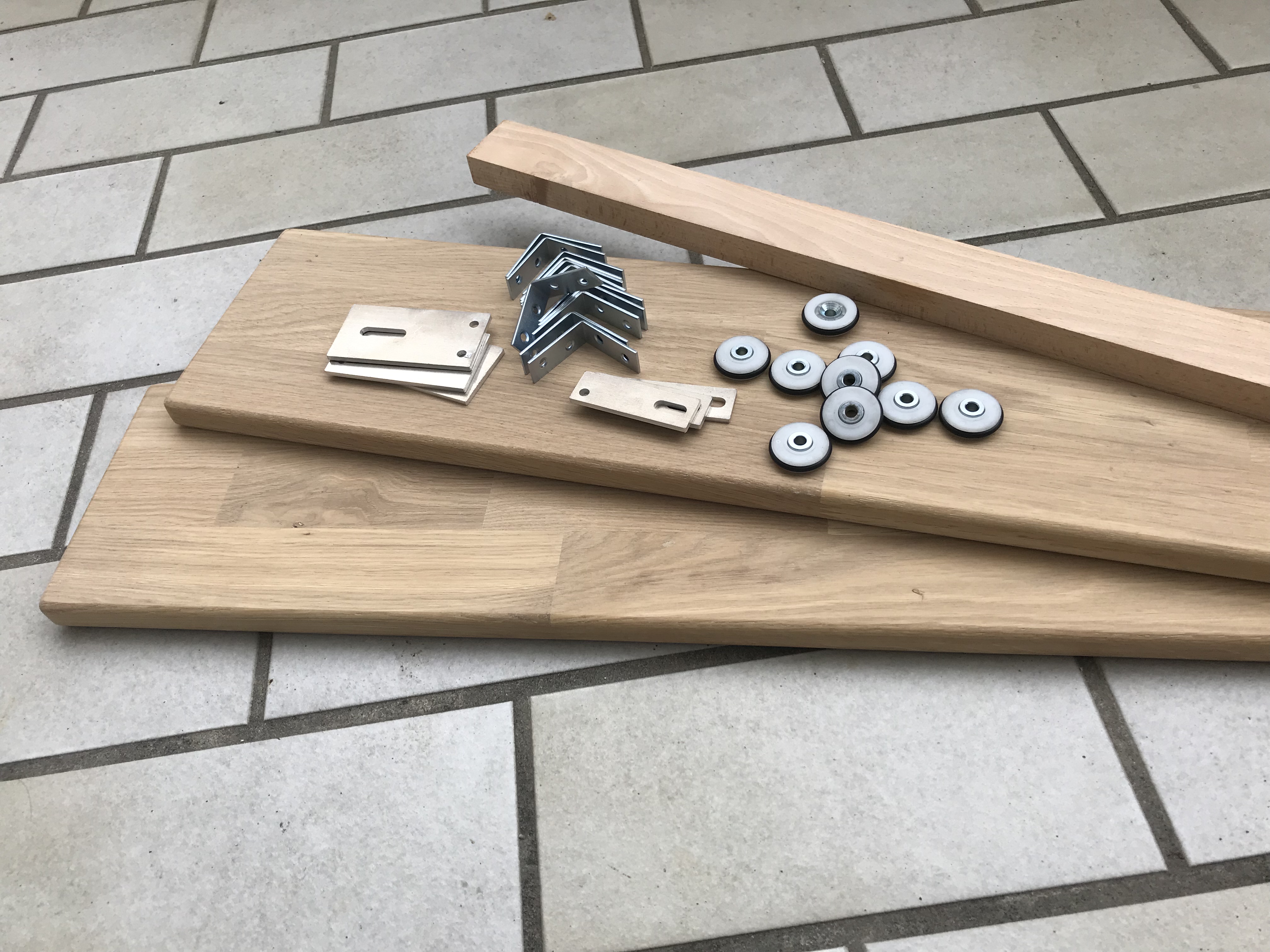 So . Heute fange ich mal mit meiner ersten Wickelbank an. Mit Paar ungenutzten Brettern , paar ausgeliehenen Ideen und Teilen vom Baumarkt und beim Bartsch mitgenommenen Rollen und fertigen Blechen ( keine Lust gehabt welche selber zu basteln Zunge raus ) baue ich mal meine Bank.