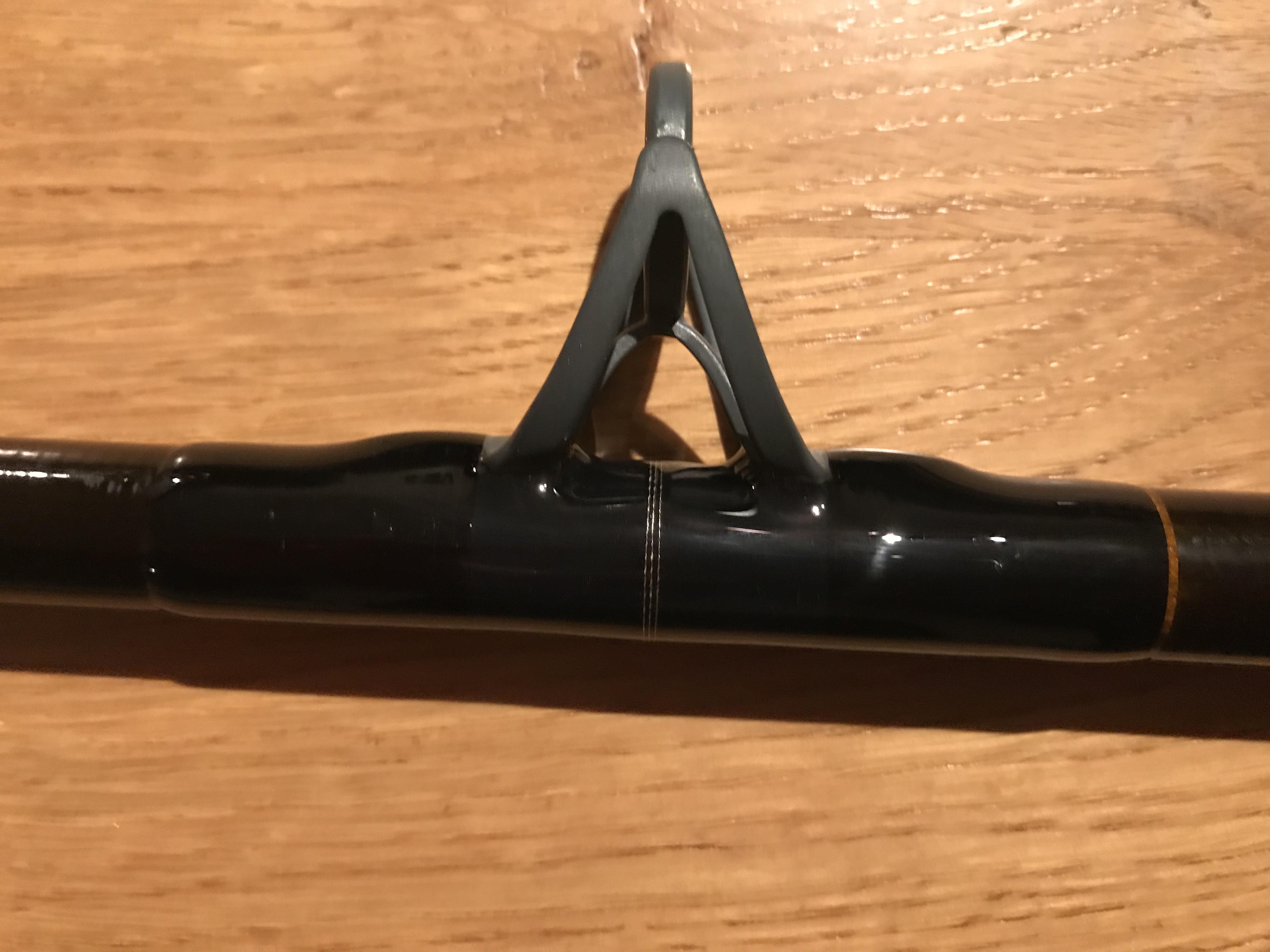 Dann wird der Kork durch einen duplon Griff ersetzt. Ein Fuji dps Rollenhalter montiert und das ganze so angebracht das die original Schrift beim verwenden einer Multirolle zu lesen ist.