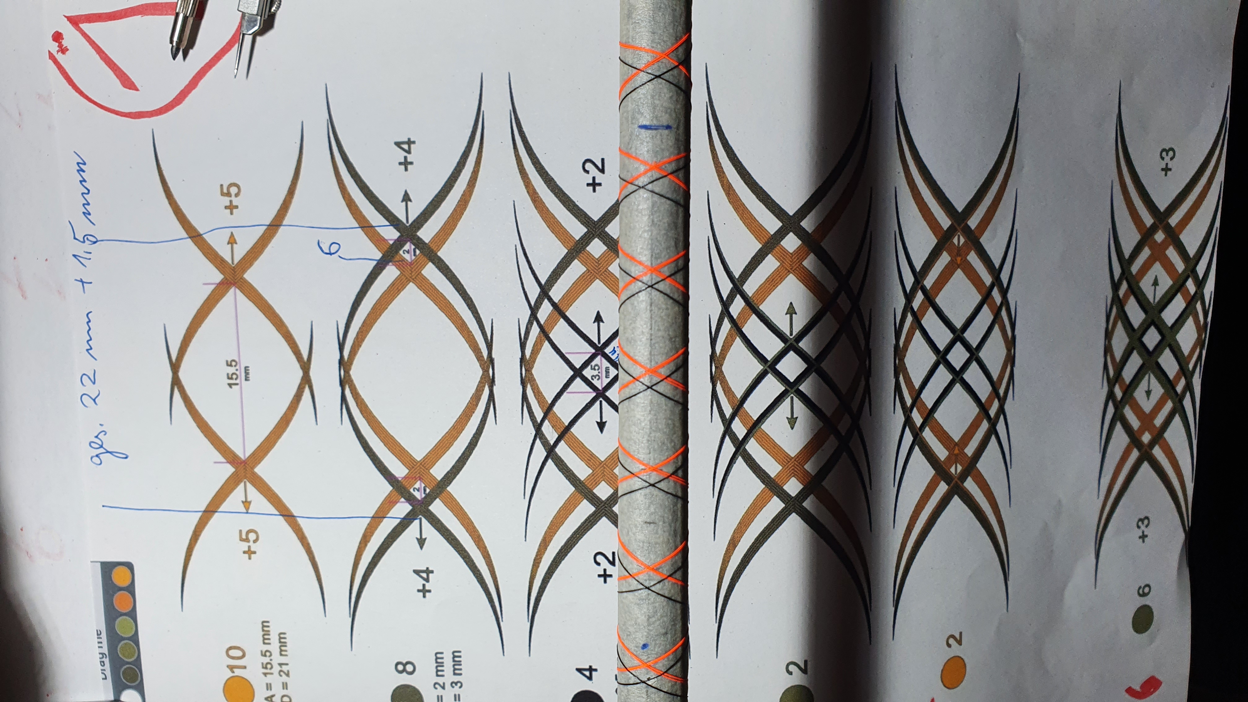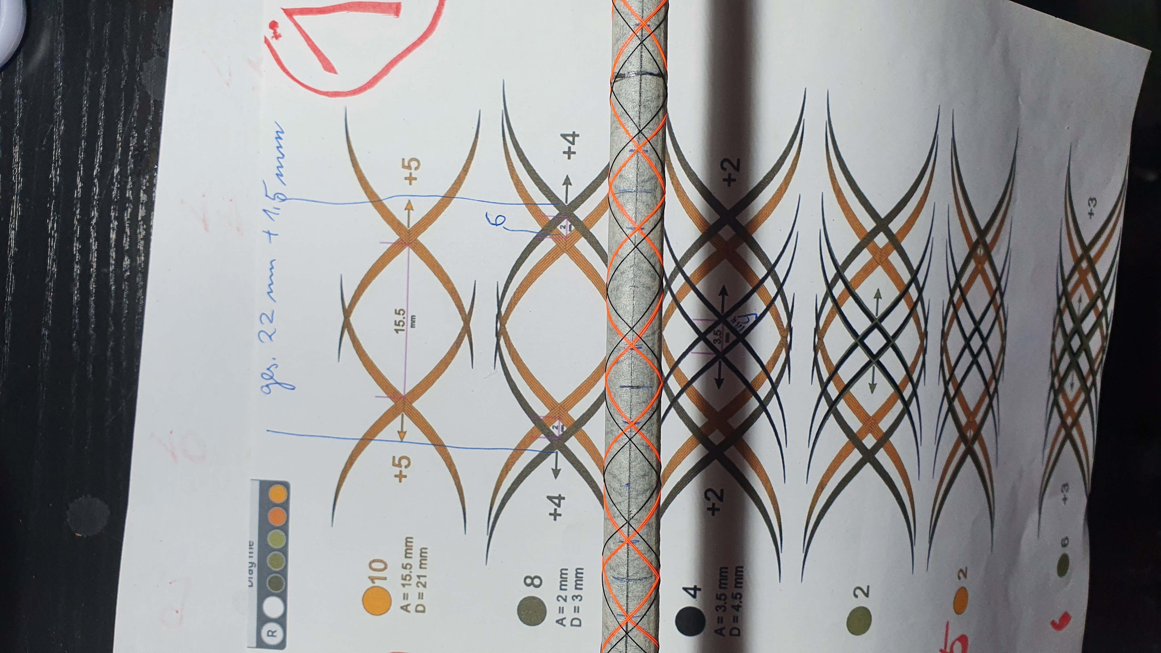 Das, was Sepp beschrieben hat, machst du als allererstes und dann werden die Punkte von dieser Markierung nach links und nach rechts, in deinem Fall 7,75mm, mach 8mm und du wirst am Ende dankbar sein, markiert wo du dann mit deiner Farbe, Orangeneon, kreuzend wickeln tust.