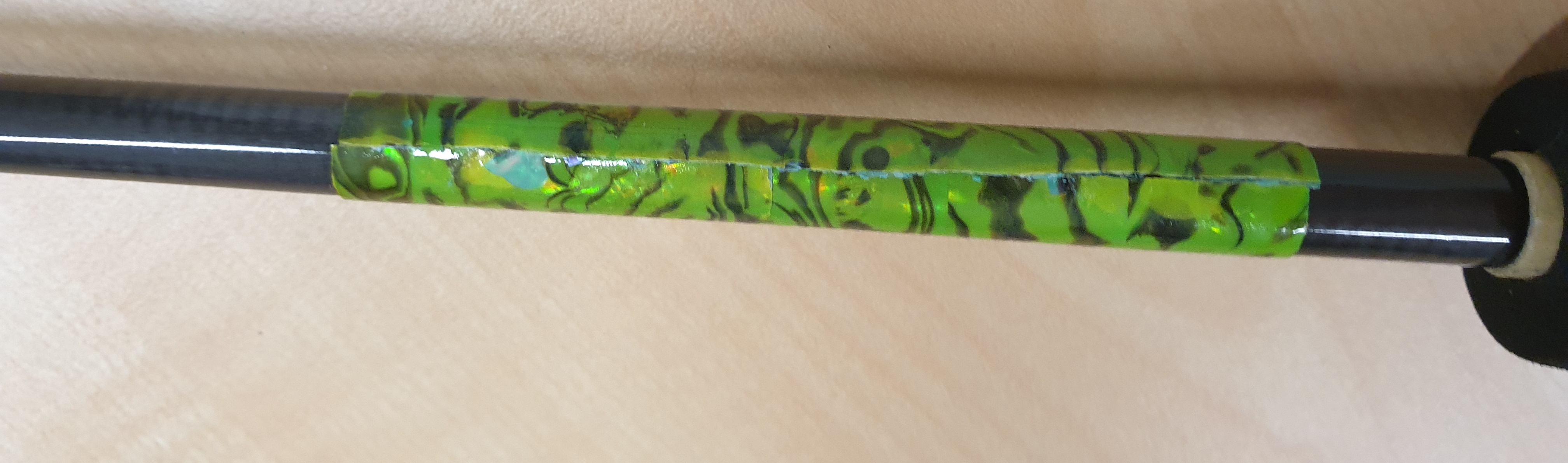 Das Material selbst ist ja recht hart, beim um den Blank wickeln bricht die Perlmuttschicht also zwangsläufig in viele kleine Stücke, die beim Überlackieren mit 2k ja wieder schön versiegelt werden. Die Verarbeitung ist aber durchaus als "Tricky" zu bezeichnen.