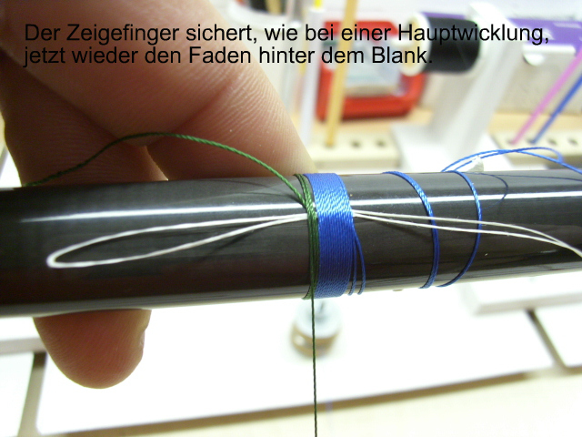 Du legst dazu ca. 15cm Trimmfaden mittig einmal gekreuzt um den Blank und wickelst beide Enden spiralförmig nach hinten. Dann dort festtapen.