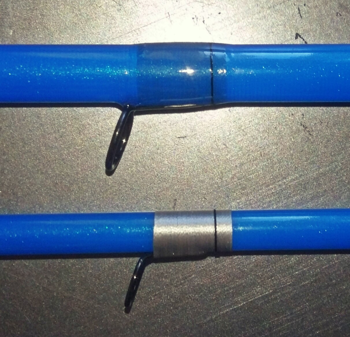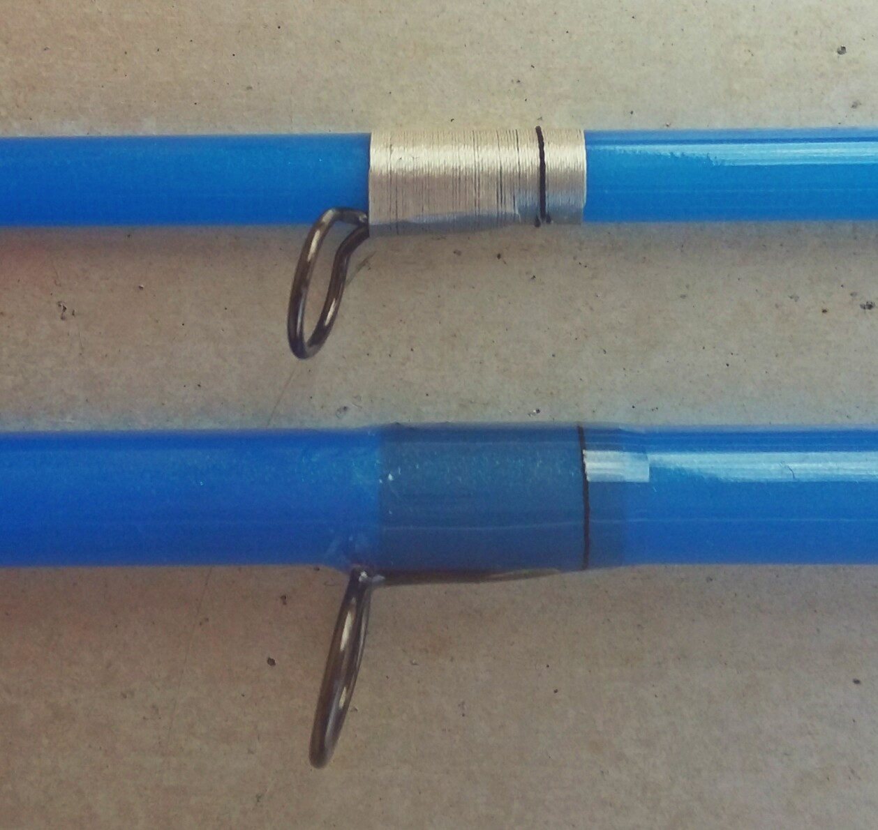 Auf der Rute sahs anders aus, drunter ist eine Kw die ich zuerst lackiert habe und darüber später den Ring mit eben dem Garn gewickelt habe, der Garn wurde blau