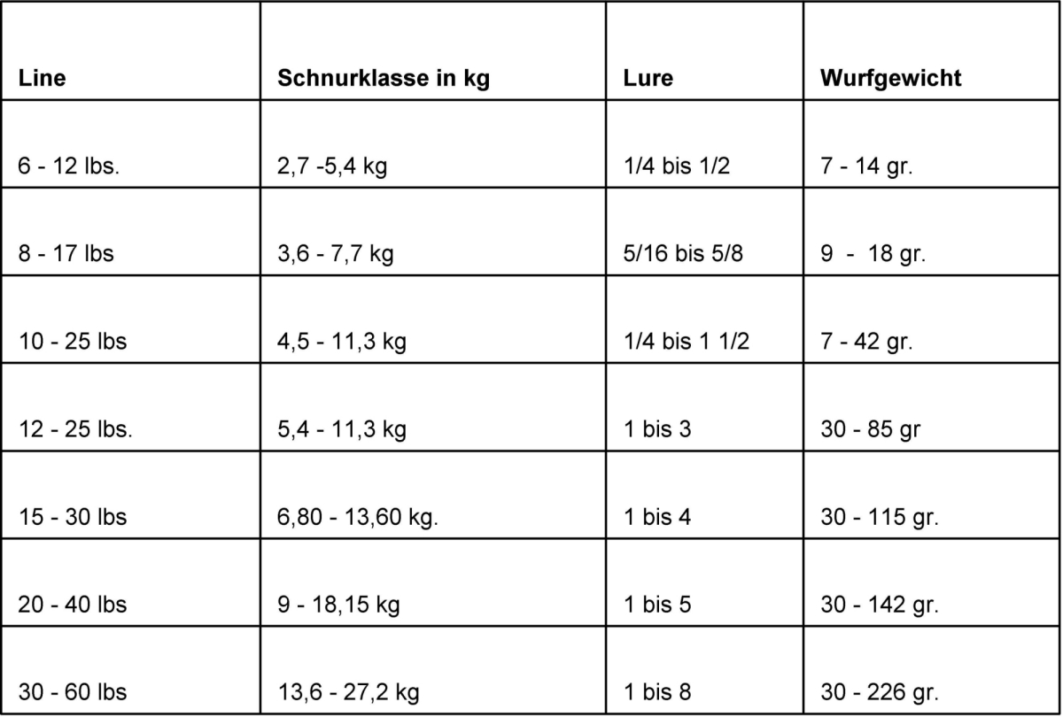 Ansonsten sind die Angaben als Line Weight Classes dann eigentlich so gemeint wie bei den BigGame-Bootsruten, da sind es sicher vertragene Belastungsklassen.