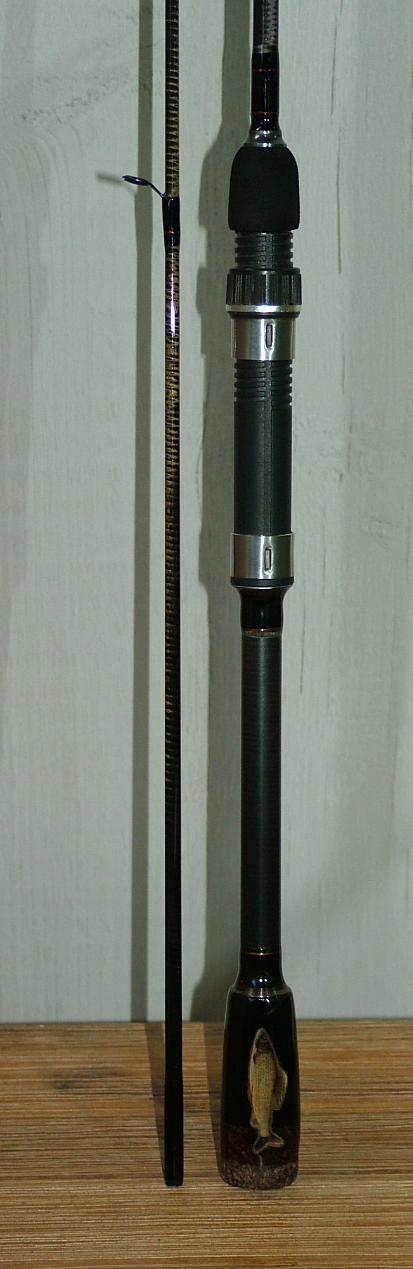Rute No 04 besteht aus den beiden vorderen Teilen einer ursprünglich dreiteiligen Matchrute. Entsprechend beringt, dient sie mir in der bevorstehenden Saison als BC-Rute zum Fischen auf Zander mit Bleikopf und Gummis. Es wurde absichtlich kein BC-Griff verbaut - erstens mag ich diese Griffe nicht und zweitens ist sie mit einer Länge von 274 cm und einem Gewicht von 152 Gramm für mich eh' nur beidhändig zu bedienen. Letztes Wochenende ausprobiert - funktioniert.