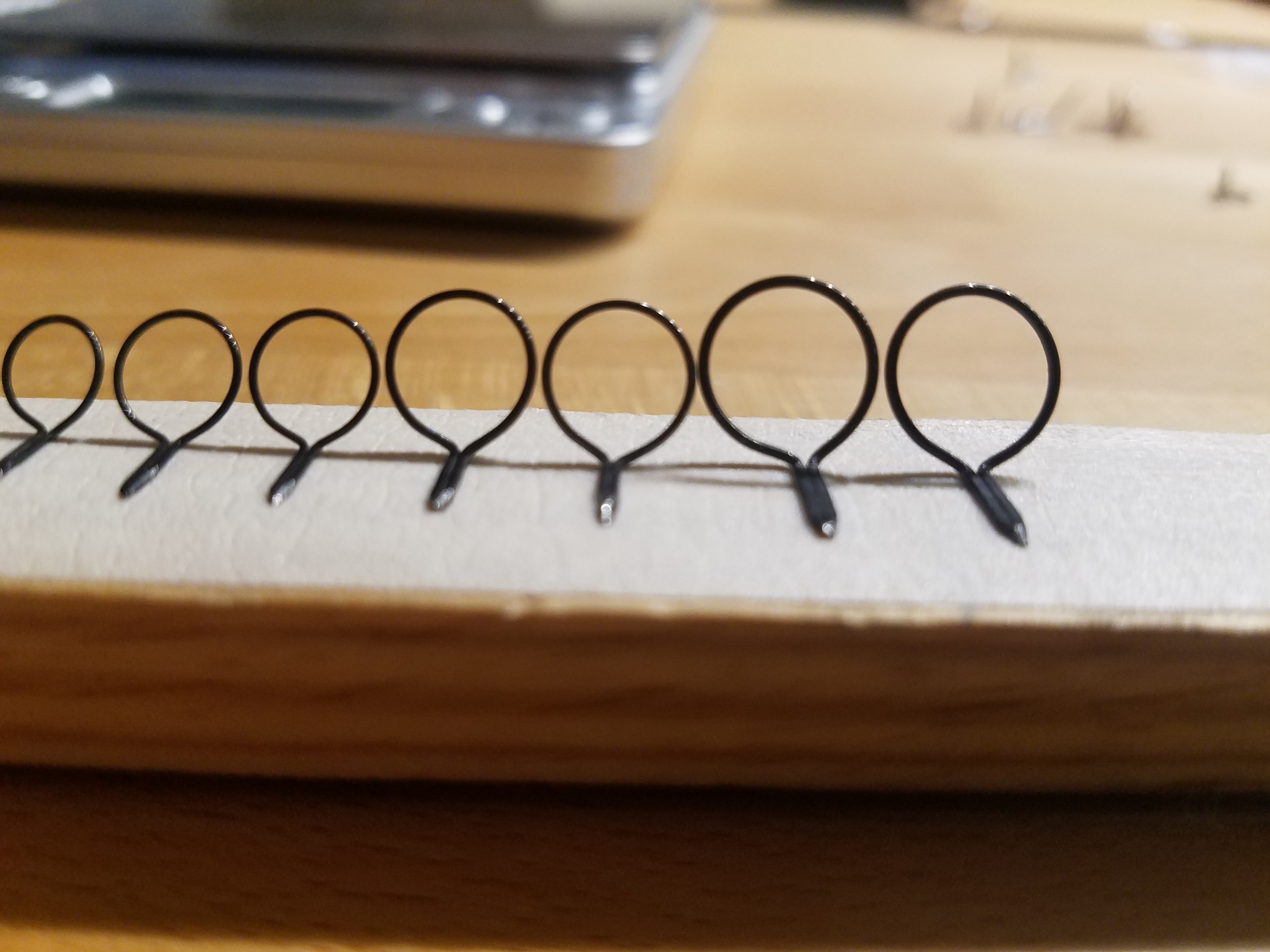 Die Vergleichsringe sind die Seymo Ringe. Die Draufsicht zeigt die Toleranzen am deutlichsten. Das Foto mit den drei Ringen sind Seymo (0,18g), Sea Guide (0,11g), Seaguide Lightwire Adaman (0,05g) mit jeweils etwa 6mm ID. Das ist die Ringgröße die ich ab der Rutenklasse 6 als kleinsten Ring verwende. Auf der Waage haben die kleinsten Ringe einen ID von ca. 5mm