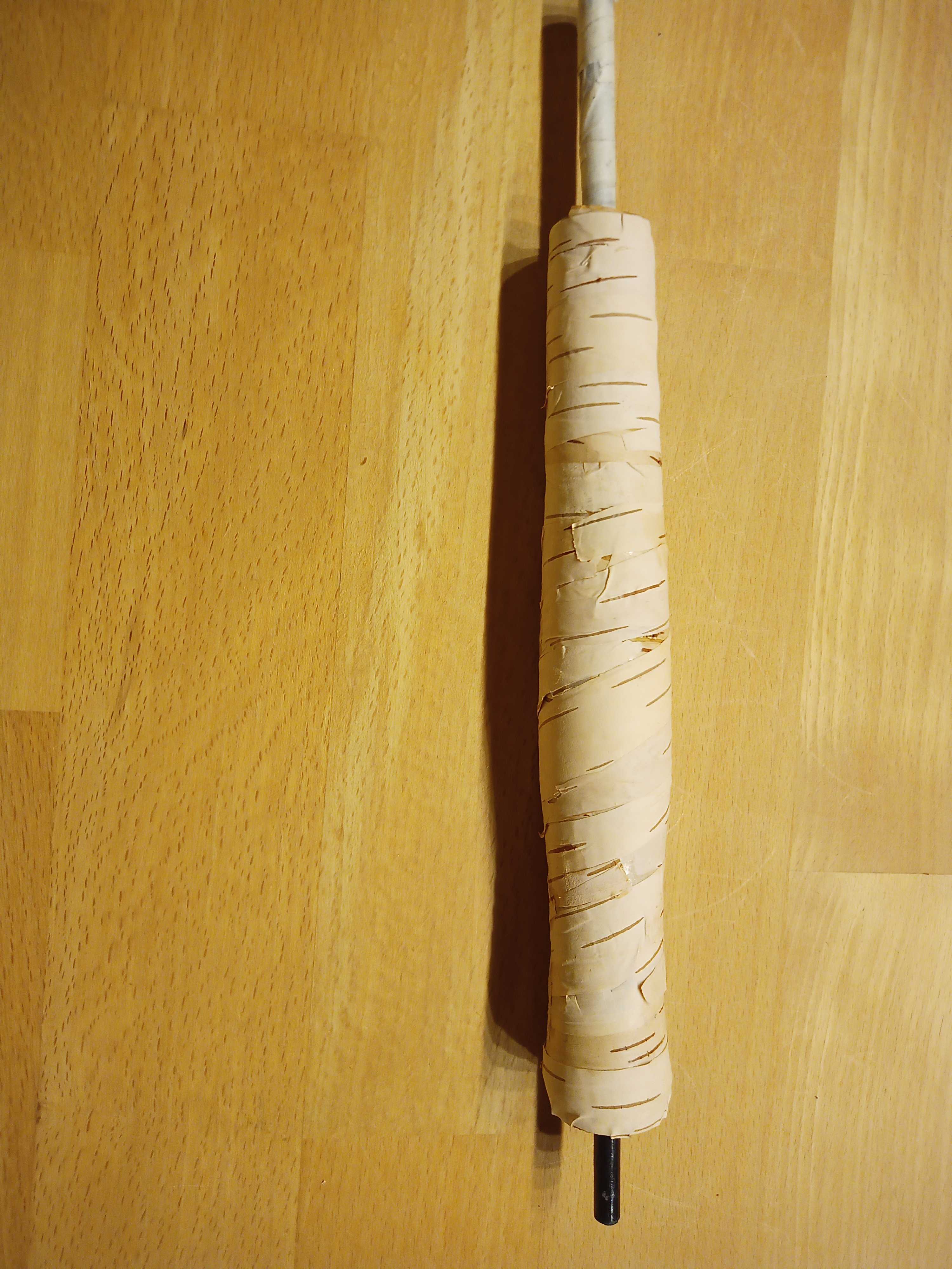 Da ich keine Lust auf einen fiesen Kleber hatte, habe ich mit Anlegemilch für Blattgold gearbeitet, eine Schicht draufgearbeitet und mit Hilfe der Anlegemilch an einigen Stellen nachgearbeitet. Das Ganze mit Flexcoat Color Preserver fixiert (dient auch als Sperrschicht für die Anlegemilch) und einmal überlackiert. Beim Schleifen habe ich dann teilweise wieder bis auf den Kork geschliffen. Also mehr Lagen, diesmal die Streifen direkt mit Anlegemilch bestrichen und auch nicht mehr so hauchdünne Streifen verwendet. Dann wieder geschliffen und an zwei Stellen nochmal nachgearbeitet. Dann Leinöl für das Farbspiel, der Lack hat mir da zu wenig Schattierungen reingebracht hat. Wieder Color Preserver als Sperrschicht (Damit kann man vermutlich sogar auf Butter lackieren) und drei Lagen Lackdrauf. Natürlich mit einem Zwischenschliff und Wegschneiden der Pickel. Dann den Griff mit feinem Schleifvliess mattiert und ein Finish aus PU Leim drüber.