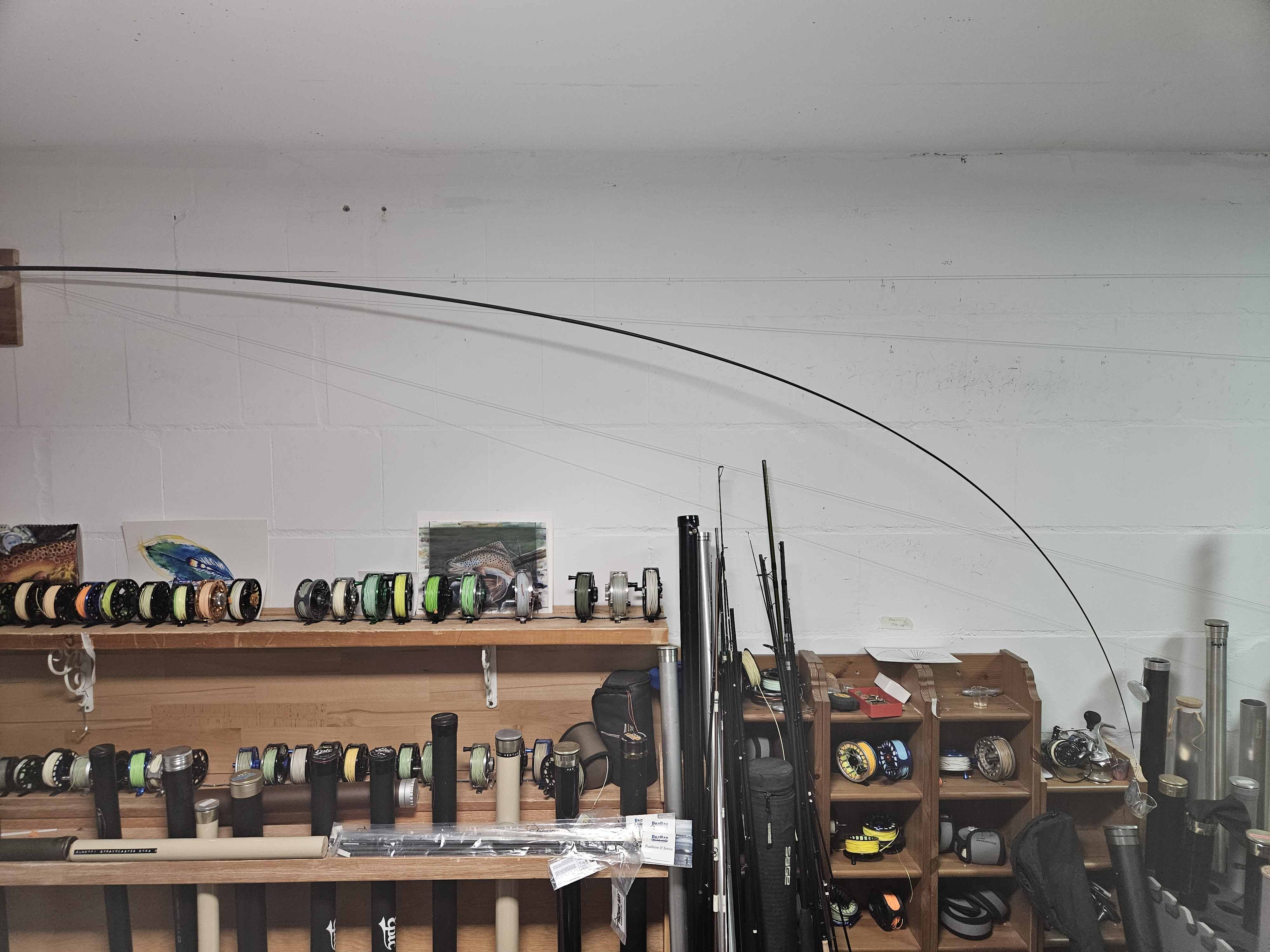 3,75° bei 19,1g also #7, 15° bei 98g also ein PF von 5,13. Das ist mal x-fast, da braucht es keinen Solitip. Und von der Biegekurve und vom Powerfaktor her auch mehr Rückgrat als man bei einer #7 erwarten würde. Die ERN von 9,8 und ein AA von bestimmt 76° bestätigen das. Ein Rückgrat das schon zur Zweihandklasse #6 passt. Ob es sich jetzt wirklich um eine Zweihandklassifizierung handelt, dahinter setze ich erstmal ein Fragezeichen. Dafür kommt mir die Wandstärke und das Gewicht des Blanks doch sehr gering vor. (Ich bin nicht sicher, was der Blank jetzt genau wiegt. Ich meine es waren 53,1g, auch wenn ich in meine Tabelle wohl versehentlich 57g eingetragen habe.) Verglichen mit meiner 11ft Quickline #8 ist sie aber ein gutes Stück schneller und von den Werten auch ein Stück weit kräftiger. Da bin ich neugierig, auch wenn ich eigentlich eine Klasse unter der Quickline landen wollte, ist eine Klasse darüber auch nicht besetzt.