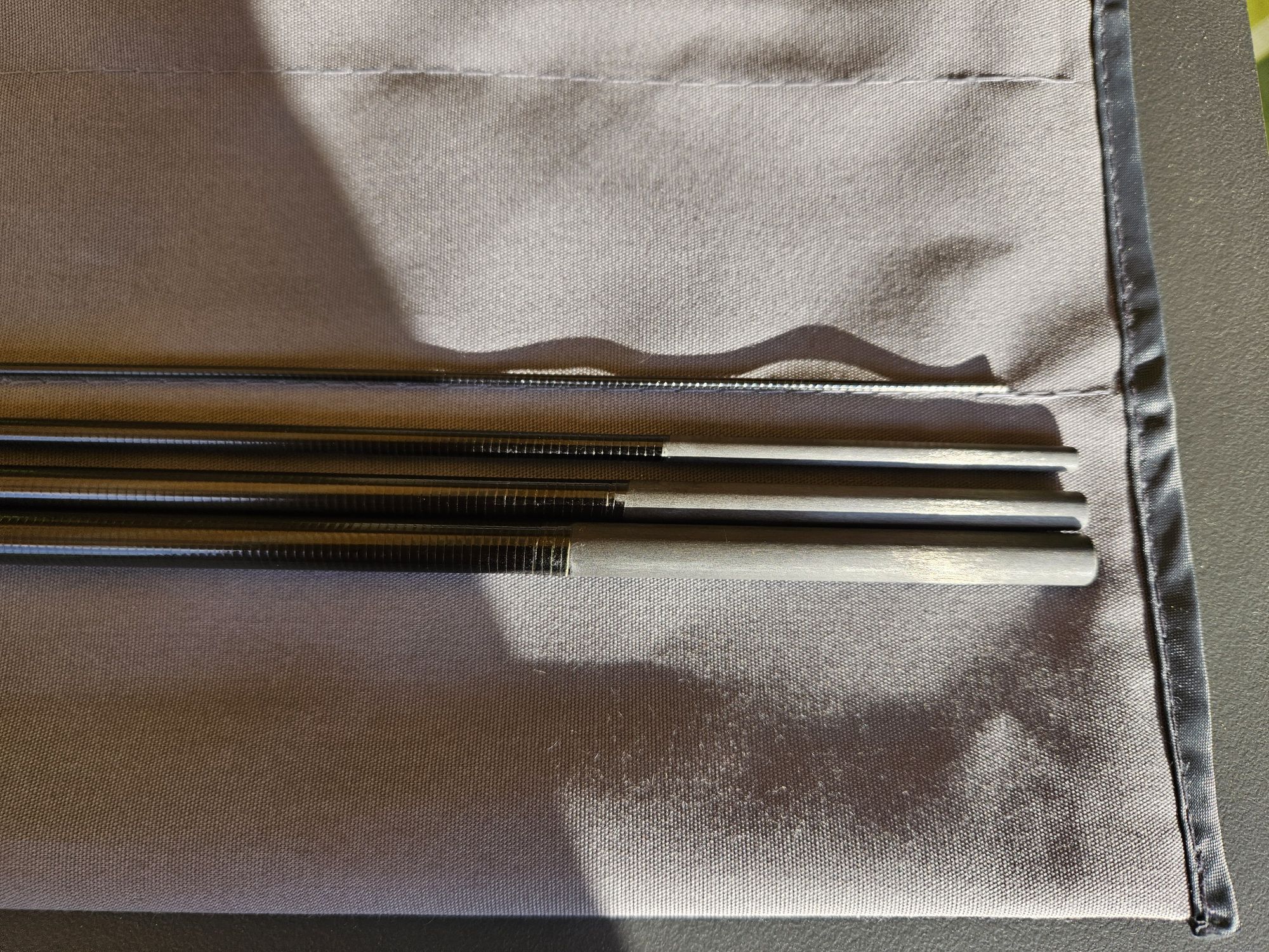 Macht einen richtig guten Eindruck der Blank. Ungeschliffen und klar lackiert finde ich ihn richtig schick. Das hochwertige und schöne Futteral ist auch dabei. Er ist extrem leicht in der Hand, sehr straff, schnell in der Aktion ohne es zu übertreiben und superfix in der Rückstellung. Schnurgerade, nur das Spitzenteil hat eine leichte Krümmung. Dieser stimmt hier nahezu mit dem Springpunkt überein und die Rute lässt sich entlang der Springpunkte gerade aufbauen. Die Steckverbindungen sitzen genau und sicher, sie fassen 57mm, 47mm und 36mm. Die geschliffenen Zapfen sind 71mm, 65mm und 58mm lang. Das Spitzenteil dürfte sich etwas weiter aufschieben lassen, oder der geschliffene Teil ein paar mm kürzer sein, dass ist aber kein Grund zu Klage, denn die perfekten „Lücken“ lassen sich durch die Lage der Zierwicklungen „einstellen“.