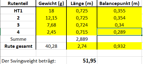 Mal sehen wie die fertige Rute aussieht, ich rechne mit knapp über 60g/m². Das Gesamtgewicht wird etwa bei 80g oder knapp darüber liegen. Kommt auf die Ringe und die Klebermenge an.