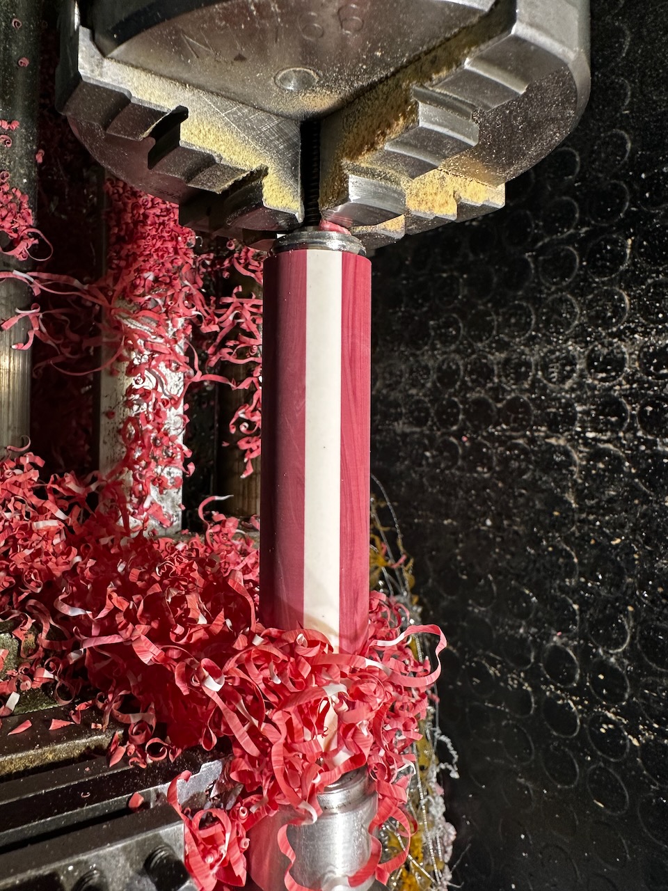 Ist der Rollenhalter aus Alu? Wirf den in NaOH und eloxier den dunkelrot ein, dann musst du nichts drehen/neu machen, hast aber etwas was zum roten Blank passt und nicht so silbrig hervorsteht.