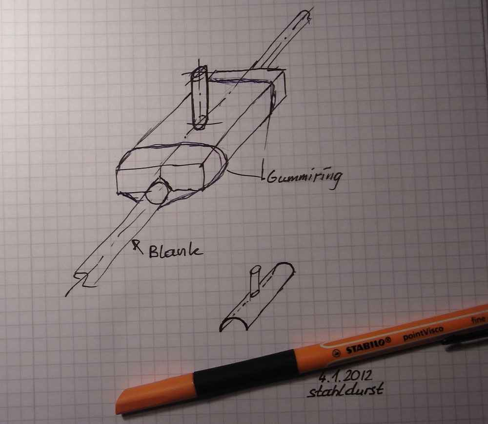 Ich hab mir auf meinen Schreibtisch mit Zwingen einen Maschinenschraubstock befestig in welchem ich ein Blankreststück oder ein Rohr geklemmt habe auf welches ich dann das zu testende Blankstück geschoben habe.