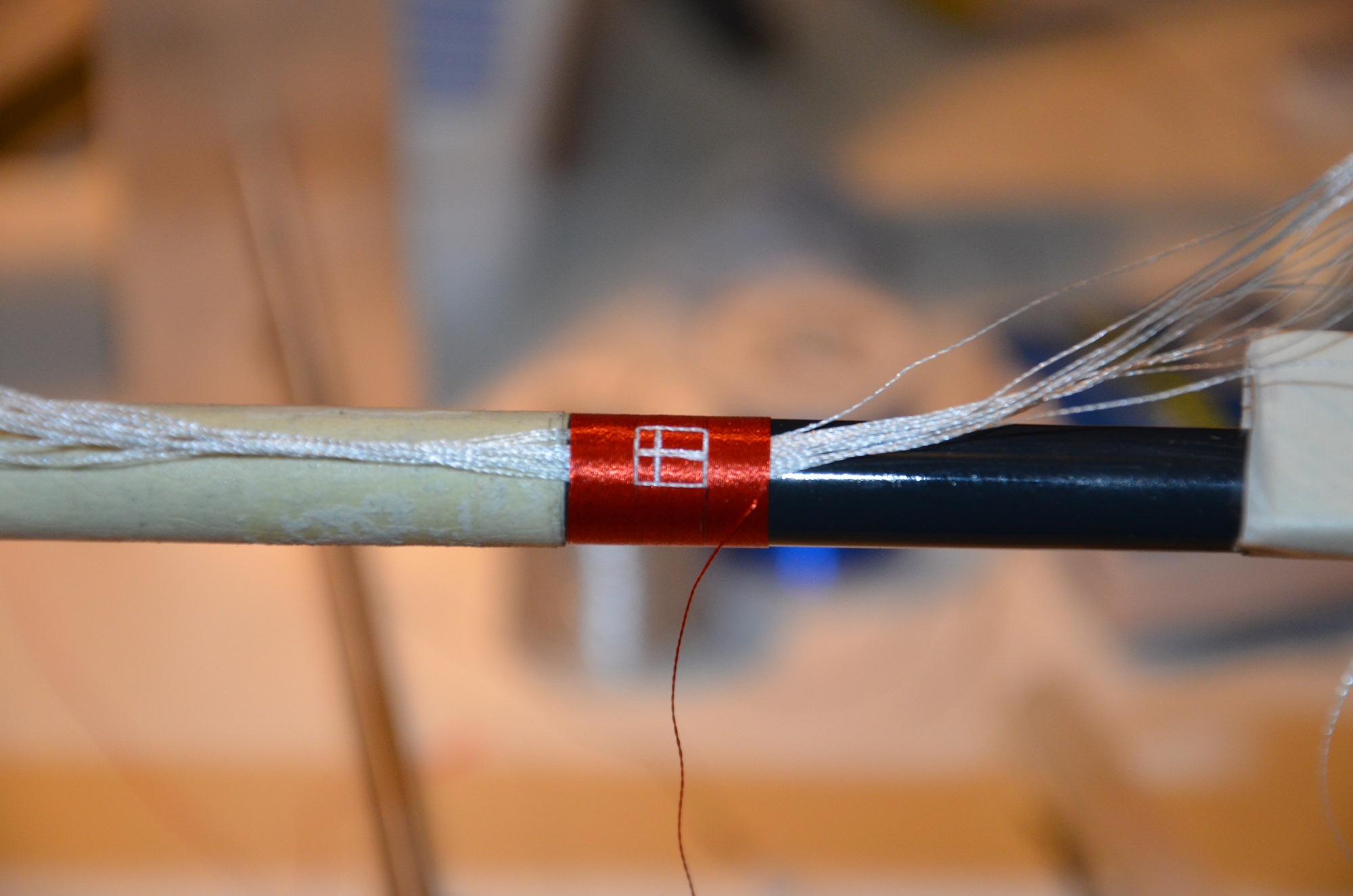 Du legst als erstes fest wie groß das Bild werden soll, bei der Dänische Flagge würde ich 18x32 Fäden vorschlagen. Grundfaden rot (der geht um den Blank) und die Längsfäden weiß(NCP) und einen weißen Faden als Rahmen.