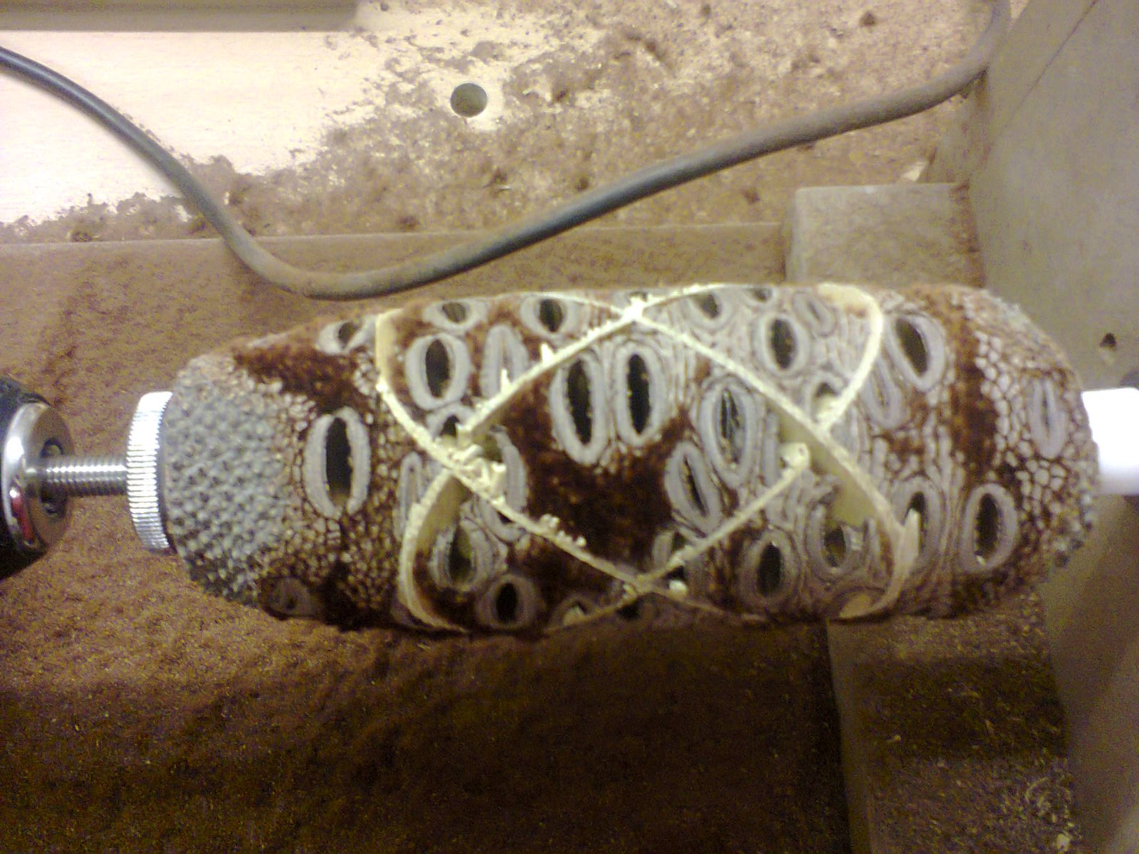 Blöderweise sind die Nüsse auch Naturprodukt, und nachdem ich schon mehrere Millimeter herunter geschliffen hatten, ist plötzlich ein vertrocknetes Stück herausgefallen, das kein Teil der Nuss sein wollte. Es war vorher nicht zu sehen, so wie die kleinen Löcher die Kork, die dann auf einmal tiefe Rillen werden. Deshalb sieht die eine Stelle aus wie Karies.